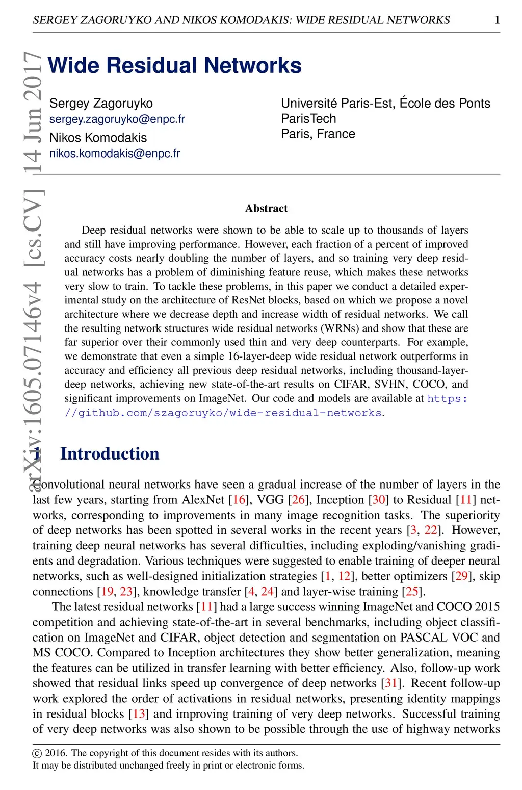 Deep residual networks were shown to be able to scale up to thousands of layers and still have improving performance. However, each fraction of a percent of improved accuracy costs nearly doubling the number of layers, and so training very deep residual networks has a problem of diminishing feature reuse, which makes these networks very slow to train. To tackle these problems, in this paper we conduct a detailed experimental study on the architecture of ResNet blocks, based on which we propose a novel architecture where we decrease depth and increase width of residual networks. We call the resulting network structures wide residual networks (WRNs) and show that these are far superior over their commonly used thin and very deep counterparts. For example, we demonstrate that even a simple 16-layer-deep wide residual network outperforms in accuracy and efficiency all previous deep residual networks, including thousand-layer-deep networks, achieving new state-of-the-art results on CIFAR, SVHN, COCO, and significant improvements on ImageNet. Our code and models are available at https://github.com/szagoruyko/wide-residual-networks