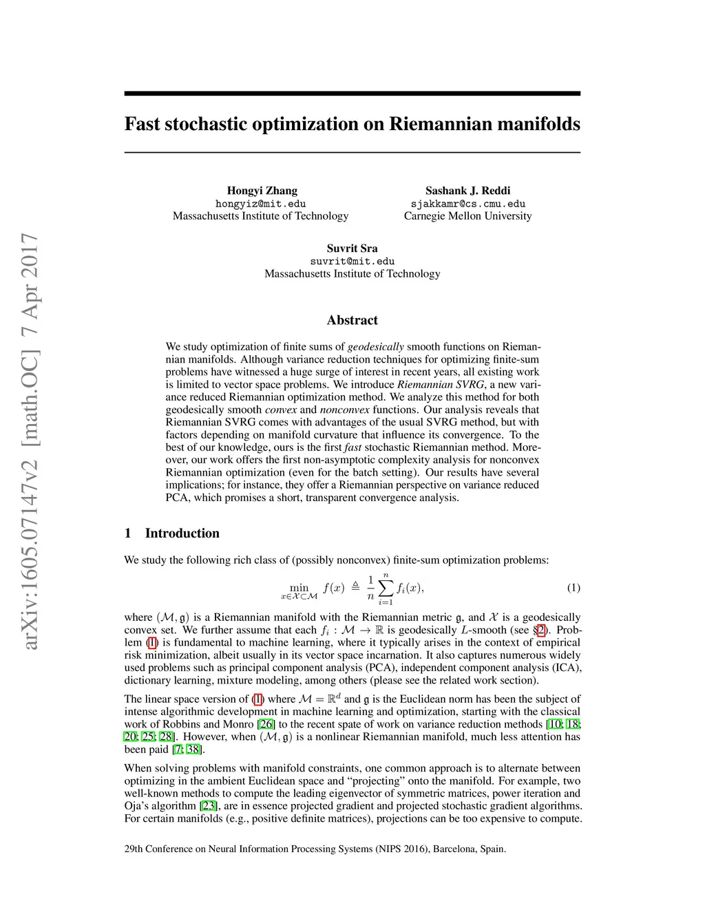 We study optimization of finite sums of geodesically smooth functions on Riemannian manifolds. Although variance reduction techniques for optimizing finite-sums have witnessed tremendous attention in the recent years, existing work is limited to vector space problems. We introduce Riemannian SVRG (RSVRG), a new variance reduced Riemannian optimization method. We analyze RSVRG for both geodesically convex and nonconvex (smooth) functions. Our analysis reveals that RSVRG inherits advantages of the usual SVRG method, but with factors depending on curvature of the manifold that influence its convergence. To our knowledge, RSVRG is the first provably fast stochastic Riemannian method. Moreover, our paper presents the first non-asymptotic complexity analysis (novel even for the batch setting) for nonconvex Riemannian optimization. Our results have several implications; for instance, they offer a Riemannian perspective on variance reduced PCA, which promises a short, transparent convergence analysis.