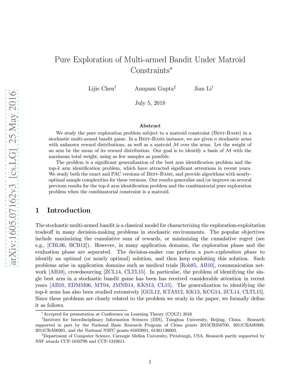 Pure Exploration of Multi-armed Bandit Under Matroid Constraints