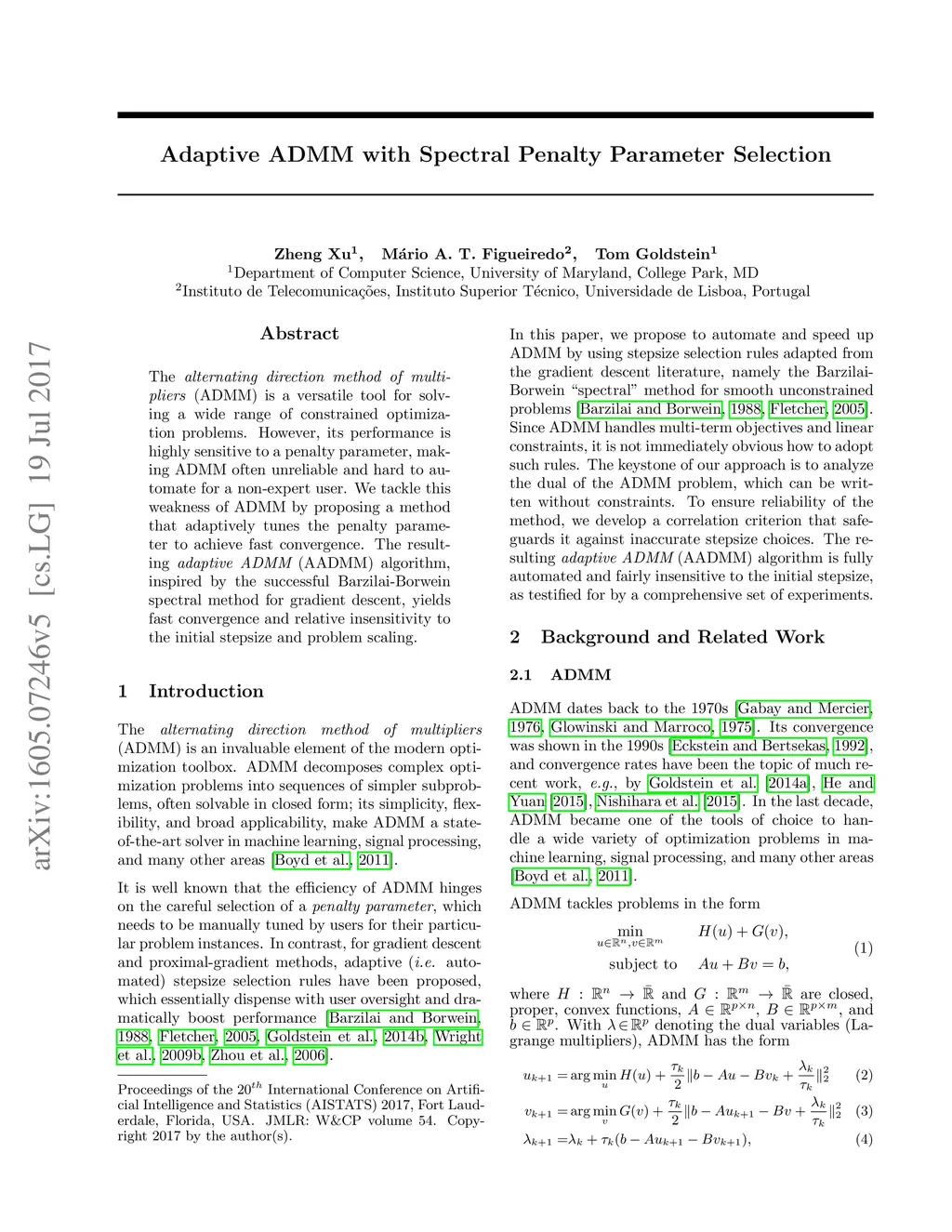 The alternating direction method of multipliers (ADMM) is a versatile tool for solving a wide range of constrained optimization problems, with differentiable or non-differentiable objective functions. Unfortunately, its performance is highly sensitive to a penalty parameter, which makes ADMM often unreliable and hard to automate for a non-expert user. We tackle this weakness of ADMM by proposing a method to adaptively tune the penalty parameters to achieve fast convergence. The resulting adaptive ADMM (AADMM) algorithm, inspired by the successful Barzilai-Borwein spectral method for gradient descent, yields fast convergence and relative insensitivity to the initial stepsize and problem scaling.