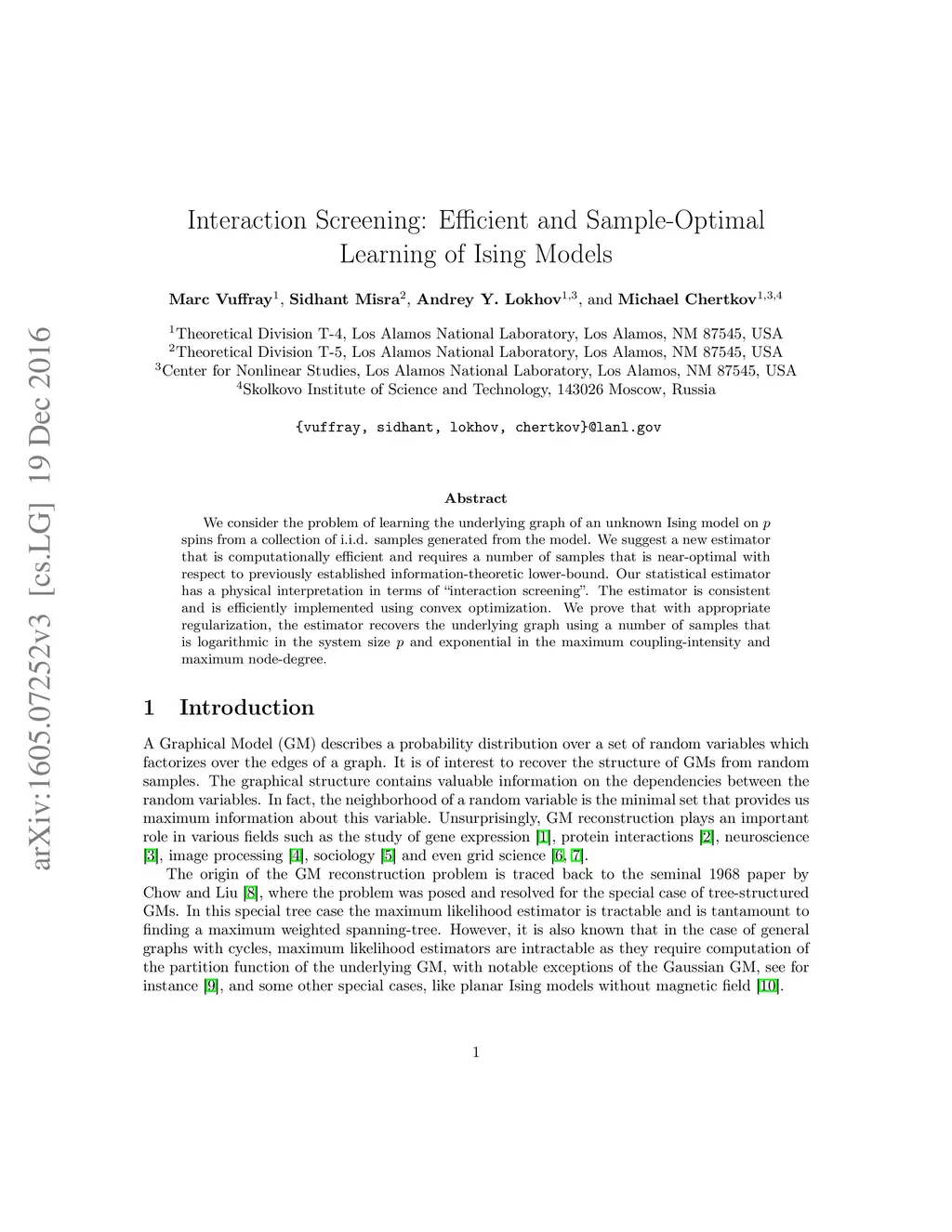 We consider the problem of learning the underlying graph of an unknown Ising model on p spins from a collection of i.i.d. samples generated from the model. We suggest a new estimator that is computationally efficient and requires a number of samples that is near-optimal with respect to previously established information-theoretic lower-bound. Our statistical estimator has a physical interpretation in terms of "interaction screening". The estimator is consistent and is efficiently implemented using convex optimization. We prove that with appropriate regularization, the estimator recovers the underlying graph using a number of samples that is logarithmic in the system size p and exponential in the maximum coupling-intensity and maximum node-degree.