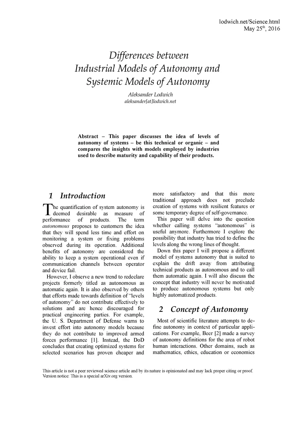 This paper discusses the idea of levels of autonomy of systems - be this technical or organic - and compares the insights with models employed by industries used to describe maturity and capability of their products.