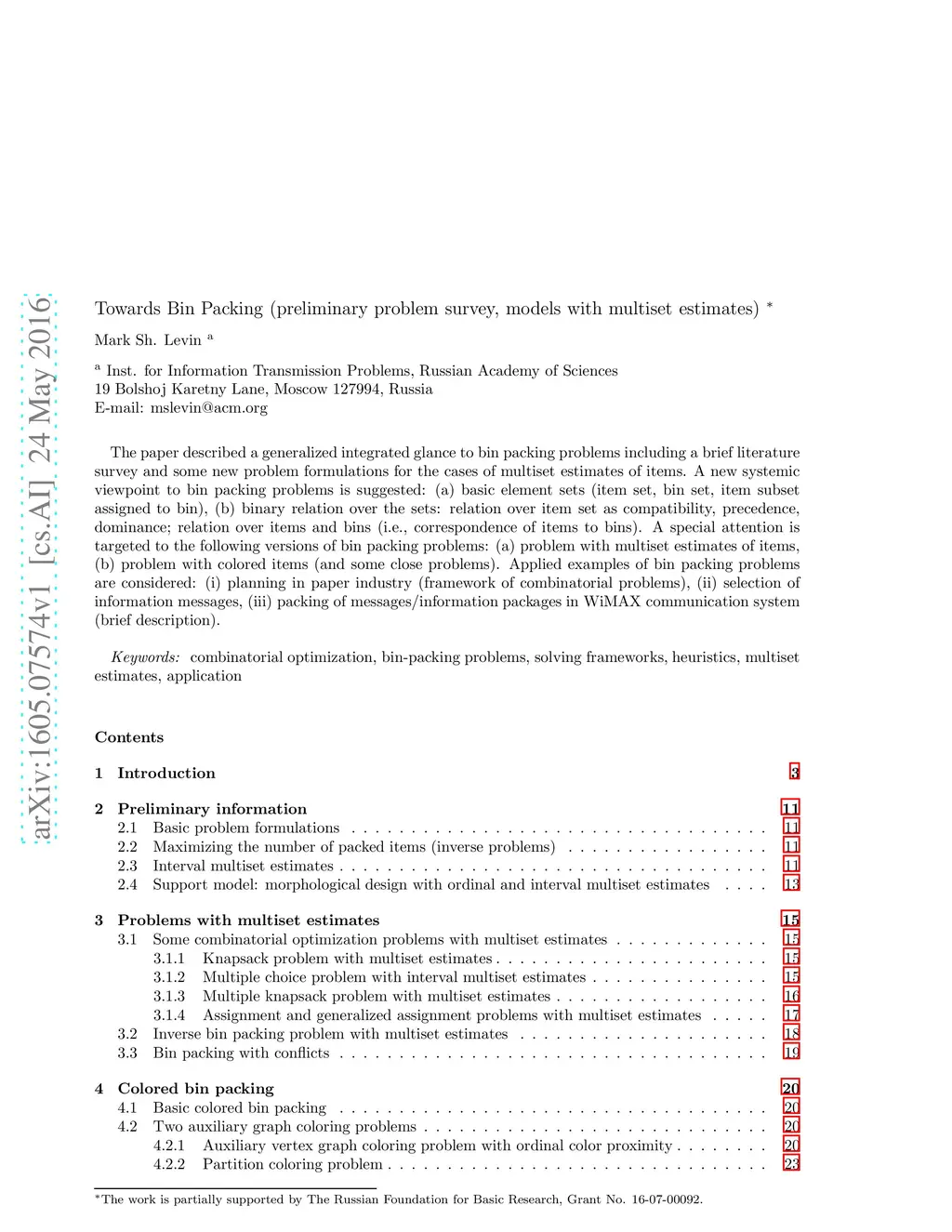 Towards Bin Packing (preliminary problem survey, models with multiset