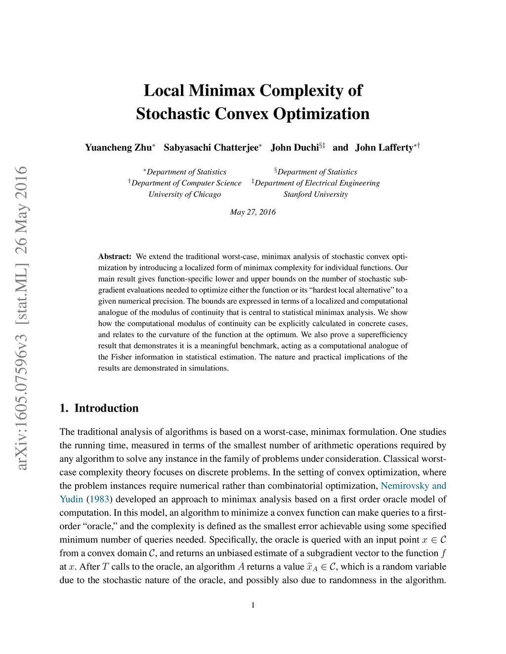 We extend the traditional worst-case, minimax analysis of stochastic convex optimization by introducing a localized form of minimax complexity for individual functions. Our main result gives function-specific lower and upper bounds on the number of stochastic subgradient evaluations needed to optimize either the function or its "hardest local alternative" to a given numerical precision. The bounds are expressed in terms of a localized and computational analogue of the modulus of continuity that is central to statistical minimax analysis. We show how the computational modulus of continuity can be explicitly calculated in concrete cases, and relates to the curvature of the function at the optimum. We also prove a superefficiency result that demonstrates it is a meaningful benchmark, acting as a computational analogue of the Fisher information in statistical estimation. The nature and practical implications of the results are demonstrated in simulations.