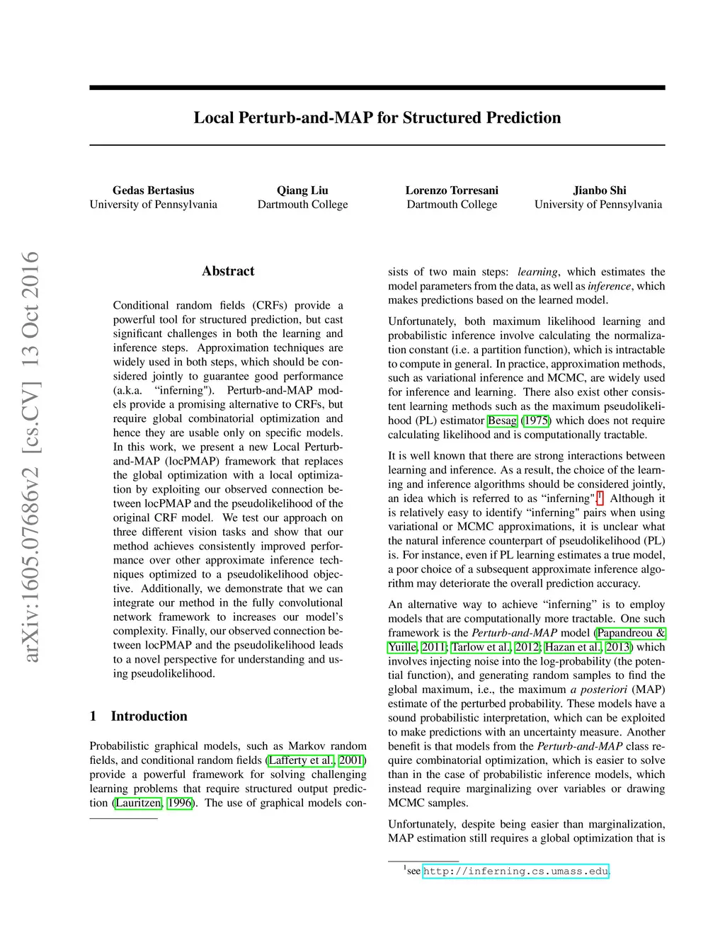 Conditional random fields (CRFs) provide a powerful tool for structured prediction, but cast significant challenges in both the learning and inference steps. Approximation techniques are widely used in both steps, which should be considered jointly to guarantee good performance (a.k.a. "inferning"). Perturb-and-MAP models provide a promising alternative to CRFs, but require global combinatorial optimization and hence they are usable only on specific models. In this work, we present a new Local Perturb-and-MAP (locPMAP) framework that replaces the global optimization with a local optimization by exploiting our observed connection between locPMAP and the pseudolikelihood of the original CRF model. We test our approach on three different vision tasks and show that our method achieves consistently improved performance over other approximate inference techniques optimized to a pseudolikelihood objective. Additionally, we demonstrate that we can integrate our method in the fully convolutional network framework to increase our model's complexity. Finally, our observed connection between locPMAP and the pseudolikelihood leads to a novel perspective for understanding and using pseudolikelihood.