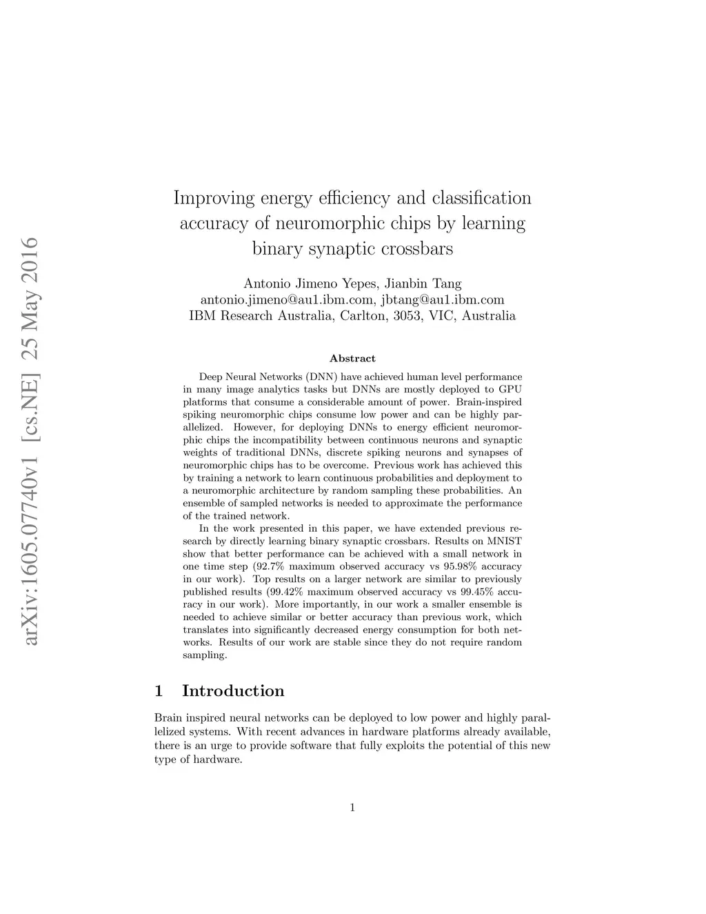 Deep Neural Networks (DNN) have achieved human level performance in many image analytics tasks but DNNs are mostly deployed to GPU platforms that consume a considerable amount of power. Brain-inspired spiking neuromorphic chips consume low power and can be highly parallelized. However, for deploying DNNs to energy efficient neuromorphic chips the incompatibility between continuous neurons and synaptic weights of traditional DNNs, discrete spiking neurons and synapses of neuromorphic chips has to be overcome. Previous work has achieved this by training a network to learn continuous probabilities and deployment to a neuromorphic architecture by random sampling these probabilities. An ensemble of sampled networks is needed to approximate the performance of the trained network. In the work presented in this paper, we have extended previous research by directly learning binary synaptic crossbars. Results on MNIST show that better performance can be achieved with a small network in one time step (92.7% maximum observed accuracy vs 95.98% accuracy in our work). Top results on a larger network are similar to previously published results (99.42% maximum observed accuracy vs 99.45% accuracy in our work). More importantly, in our work a smaller ensemble is needed to achieve similar or better accuracy than previous work, which translates into significantly decreased energy consumption for both networks. Results of our work are stable since they do not require random sampling.