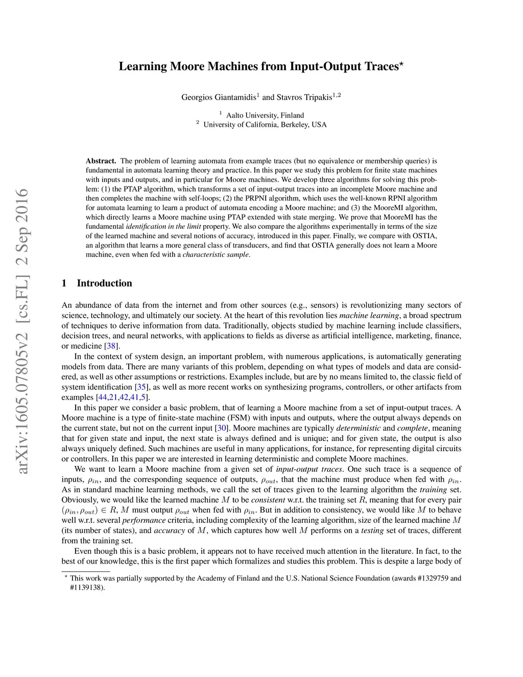 The problem of learning automata from example traces (but no equivalence or membership queries) is fundamental in automata learning theory and practice. In this paper we study this problem for finite state machines with inputs and outputs, and in particular for Moore machines. We develop three algorithms for solving this problem: (1) the PTAP algorithm, which transforms a set of input-output traces into an incomplete Moore machine and then completes the machine with self-loops; (2) the PRPNI algorithm, which uses the well-known RPNI algorithm for automata learning to learn a product of automata encoding a Moore machine; and (3) the MooreMI algorithm, which directly learns a Moore machine using PTAP extended with state merging. We prove that MooreMI has the fundamental identification in the limit property. We also compare the algorithms experimentally in terms of the size of the learned machine and several notions of accuracy, introduced in this paper. Finally, we compare with OSTIA, an algorithm that learns a more general class of transducers, and find that OSTIA generally does not learn a Moore machine, even when fed with a characteristic sample.