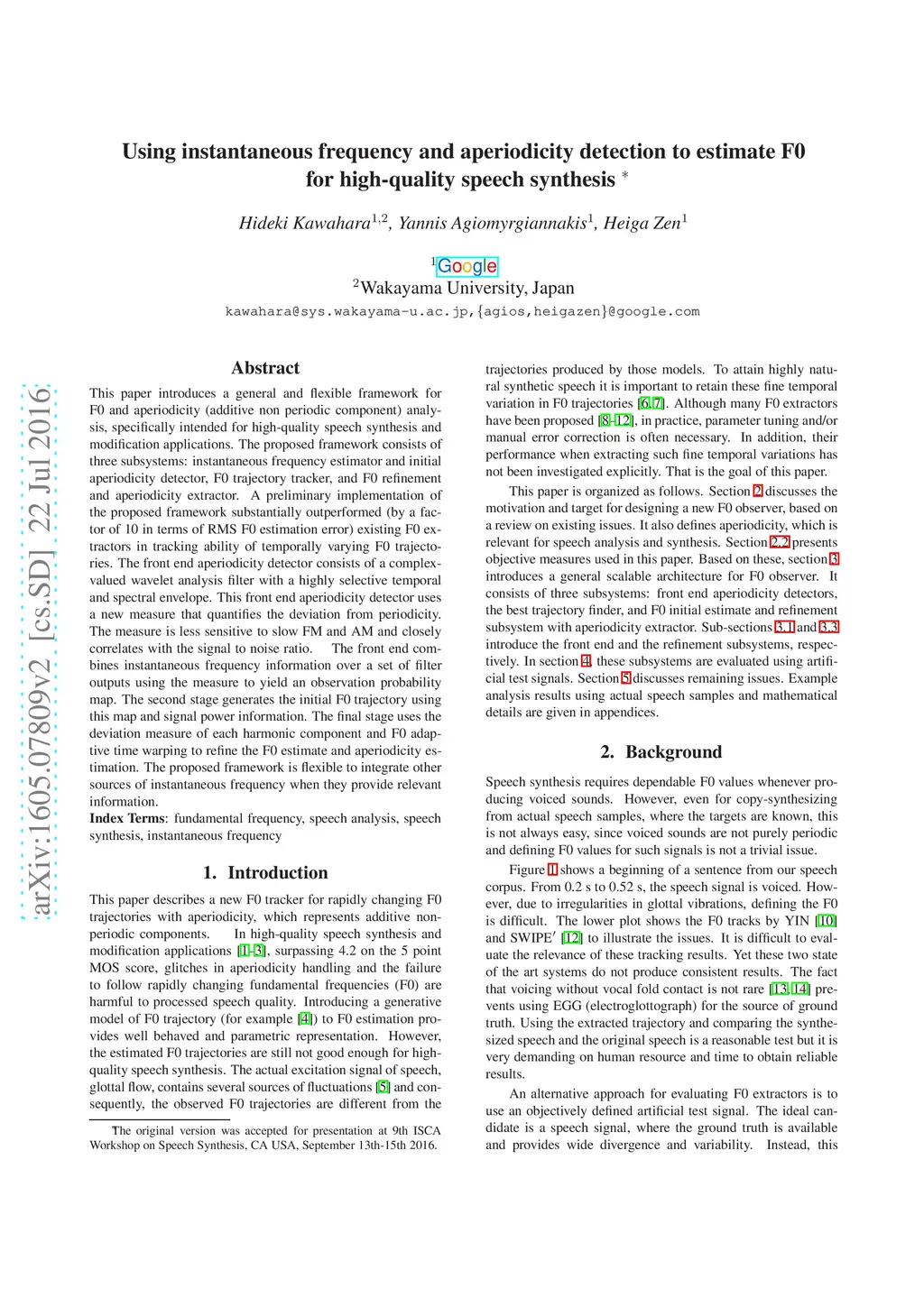 This paper introduces a general and flexible framework for F0 and aperiodicity (additive non periodic component) analysis, specifically intended for high-quality speech synthesis and modification applications. The proposed framework consists of three subsystems: instantaneous frequency estimator and initial aperiodicity detector, F0 trajectory tracker, and F0 refinement and aperiodicity extractor. A preliminary implementation of the proposed framework substantially outperformed (by a factor of 10 in terms of RMS F0 estimation error) existing F0 extractors in tracking ability of temporally varying F0 trajectories. The front end aperiodicity detector consists of a complex-valued wavelet analysis filter with a highly selective temporal and spectral envelope. This front end aperiodicity detector uses a new measure that quantifies the deviation from periodicity. The measure is less sensitive to slow FM and AM and closely correlates with the signal to noise ratio.