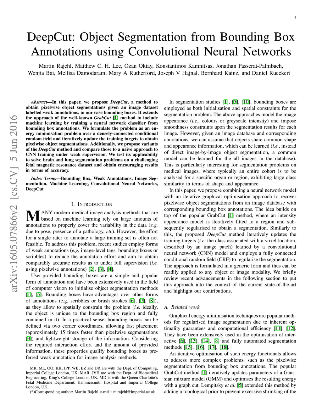In this paper, we propose DeepCut, a method to obtain pixelwise object segmentations given an image dataset labelled with bounding box annotations. It extends the approach of the well-known GrabCut method to include machine learning by training a neural network classifier from bounding box annotations. We formulate the problem as an energy minimisation problem over a densely-connected conditional random field and iteratively update the training targets to obtain pixelwise object segmentations. Additionally, we propose variants of the DeepCut method and compare those to a naive approach to CNN training under weak supervision. We test its applicability to solve brain and lung segmentation problems on a challenging fetal magnetic resonance dataset and obtain encouraging results in terms of accuracy.