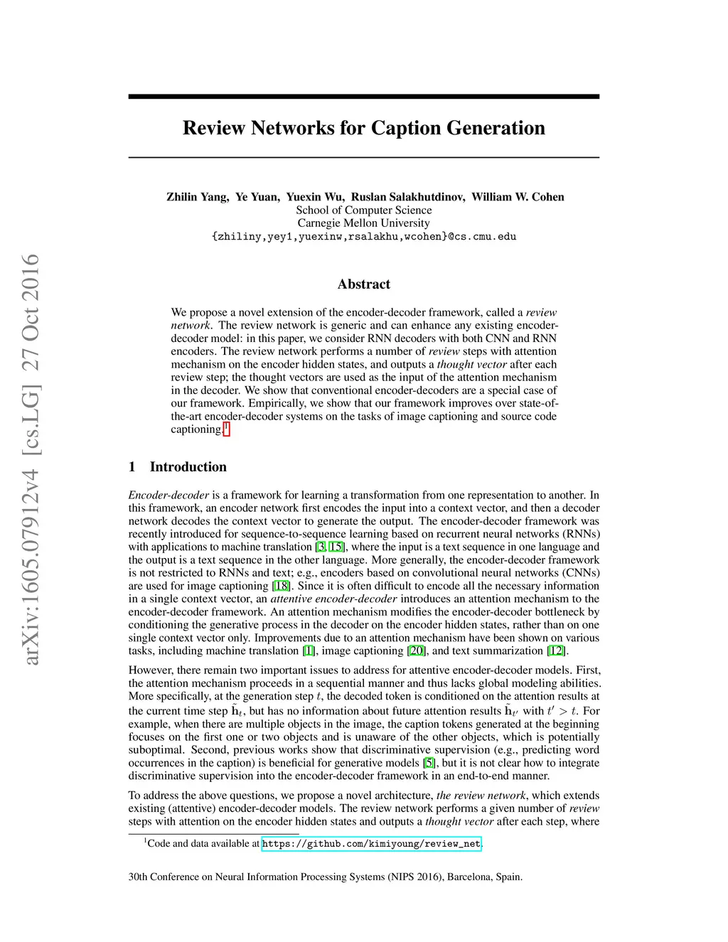We propose a novel extension of the encoder-decoder framework, called a review network. The review network is generic and can enhance any existing encoder- decoder model: in this paper, we consider RNN decoders with both CNN and RNN encoders. The review network performs a number of review steps with attention mechanism on the encoder hidden states, and outputs a thought vector after each review step; the thought vectors are used as the input of the attention mechanism in the decoder. We show that conventional encoder-decoders are a special case of our framework. Empirically, we show that our framework improves over state-of- the-art encoder-decoder systems on the tasks of image captioning and source code captioning.
