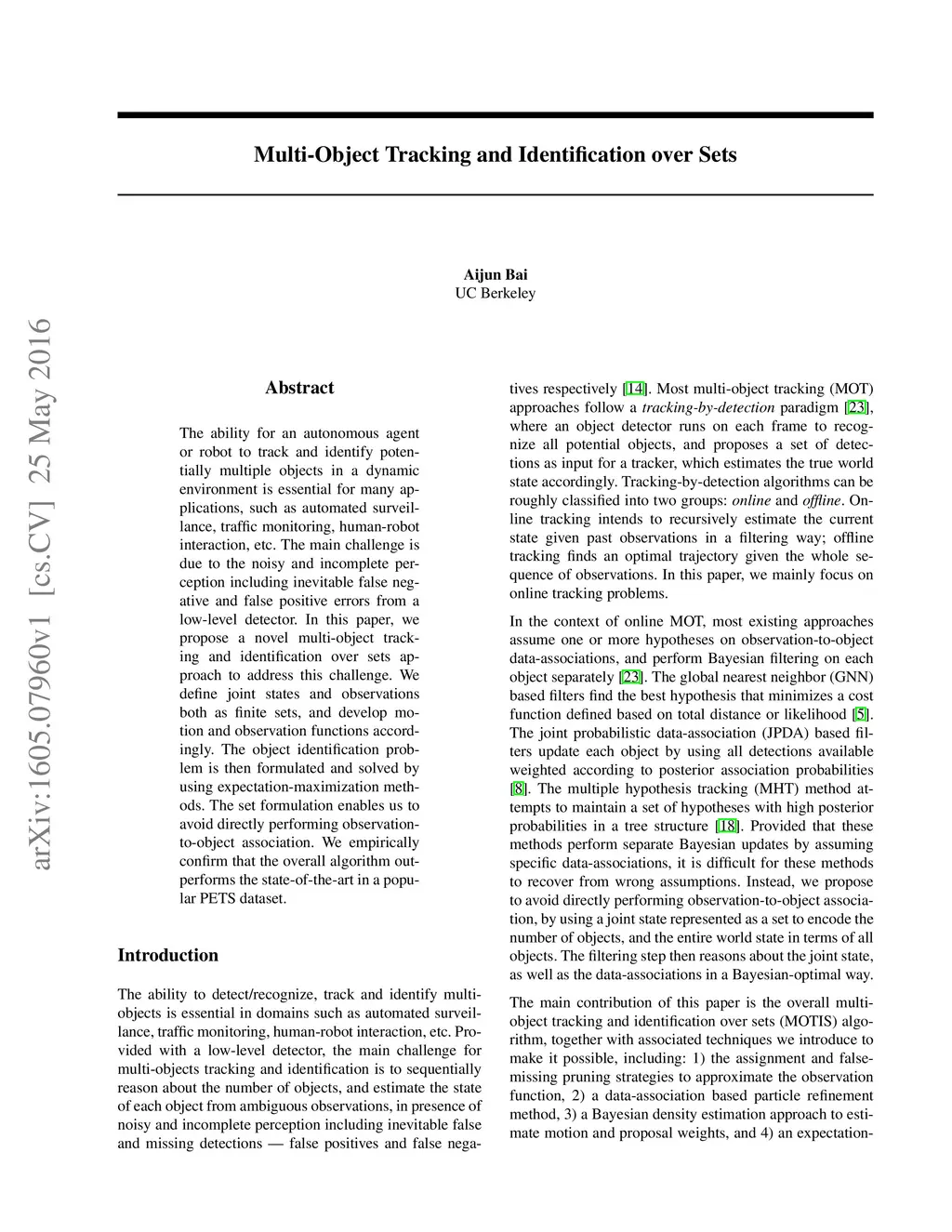 The ability for an autonomous agent or robot to track and identify potentially multiple objects in a dynamic environment is essential for many applications, such as automated surveillance, traffic monitoring, human-robot interaction, etc. The main challenge is due to the noisy and incomplete perception including inevitable false negative and false positive errors from a low-level detector. In this paper, we propose a novel multi-object tracking and identification over sets approach to address this challenge. We define joint states and observations both as finite sets, and develop motion and observation functions accordingly. The object identification problem is then formulated and solved by using expectation-maximization methods. The set formulation enables us to avoid directly performing observation-to-object association. We empirically confirm that the overall algorithm outperforms the state-of-the-art in a popular PETS dataset.