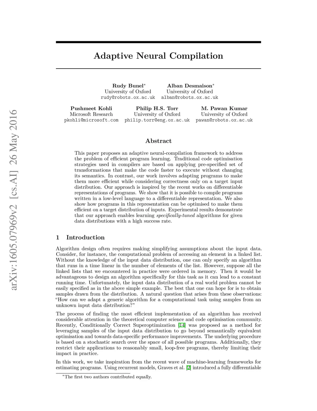 This paper proposes an adaptive neural-compilation framework to address the problem of efficient program learning. Traditional code optimisation strategies used in compilers are based on applying pre-specified set of transformations that make the code faster to execute without changing its semantics. In contrast, our work involves adapting programs to make them more efficient while considering correctness only on a target input distribution. Our approach is inspired by the recent works on differentiable representations of programs. We show that it is possible to compile programs written in a low-level language to a differentiable representation. We also show how programs in this representation can be optimised to make them efficient on a target distribution of inputs. Experimental results demonstrate that our approach enables learning specifically-tuned algorithms for given data distributions with a high success rate.