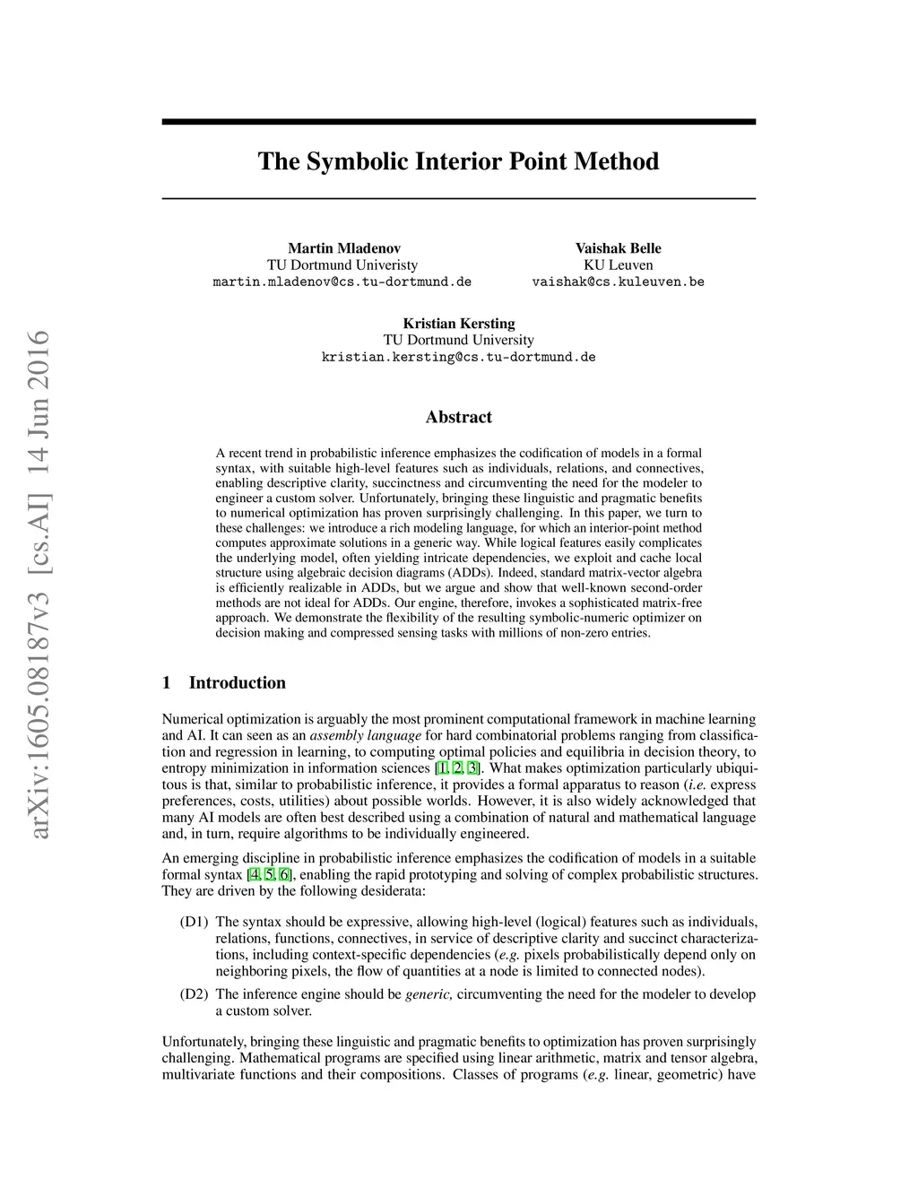 A recent trend in probabilistic inference emphasizes the codification of models in a formal syntax, with suitable high-level features such as individuals, relations, and connectives, enabling descriptive clarity, succinctness and circumventing the need for the modeler to engineer a custom solver. Unfortunately, bringing these linguistic and pragmatic benefits to numerical optimization has proven surprisingly challenging. In this paper, we turn to these challenges: we introduce a rich modeling language, for which an interior-point method computes approximate solutions in a generic way. While logical features easily complicates the underlying model, often yielding intricate dependencies, we exploit and cache local structure using algebraic decision diagrams (ADDs). Indeed, standard matrix-vector algebra is efficiently realizable in ADDs, but we argue and show that well-known optimization methods are not ideal for ADDs. Our engine, therefore, invokes a sophisticated matrix-free approach. We demonstrate the flexibility of the resulting symbolic-numeric optimizer on decision making and compressed sensing tasks with millions of non-zero entries.