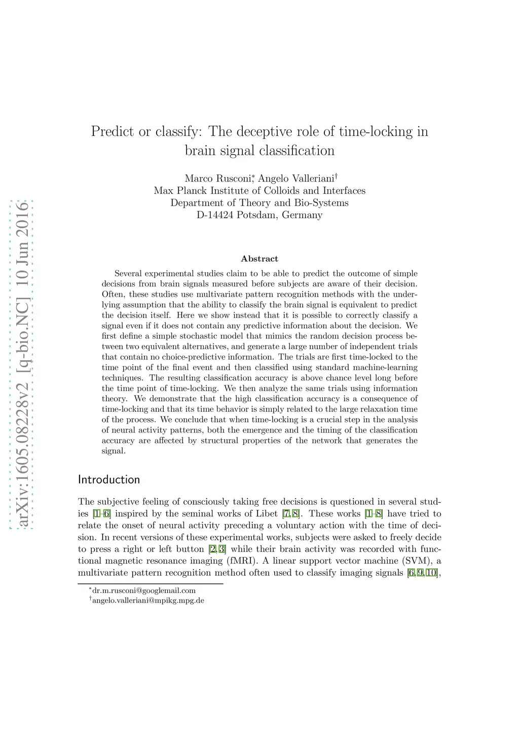 Several experimental studies claim to be able to predict the outcome of simple decisions from brain signals measured before subjects are aware of their decision. Often, these studies use multivariate pattern recognition methods with the underlying assumption that the ability to classify the brain signal is equivalent to predict the decision itself. Here we show instead that it is possible to correctly classify a signal even if it does not contain any predictive information about the decision. We first define a simple stochastic model that mimics the random decision process between two equivalent alternatives, and generate a large number of independent trials that contain no choice-predictive information. The trials are first time-locked to the time point of the final event and then classified using standard machine-learning techniques. The resulting classification accuracy is above chance level long before the time point of time-locking. We then analyze the same trials using information theory. We demonstrate that the high classification accuracy is a consequence of time-locking and that its time behavior is simply related to the large relaxation time of the process. We conclude that when time-locking is a crucial step in the analysis of neural activity patterns, both the emergence and the timing of the classification accuracy are affected by structural properties of the network that generates the signal.