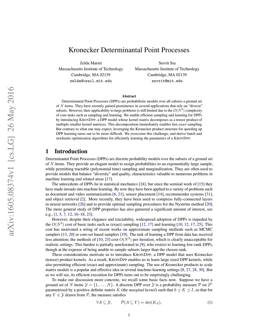Determinantal Point Processes (DPPs) are probabilistic models over all subsets a ground set of items. They have recently gained prominence in several applications that rely on "diverse" subsets. However, their applicability to large problems is still limited due to the complexity of core tasks such as sampling and learning. We enable efficient sampling and learning for DPPs by introducing KronDPP, a DPP model whose kernel matrix decomposes as a tensor product of multiple smaller kernel matrices. This decomposition immediately enables fast exact sampling. But contrary to what one may expect, leveraging the Kronecker product structure for speeding up DPP learning turns out to be more difficult. We overcome this challenge, and derive batch and stochastic optimization algorithms for efficiently learning the parameters of a KronDPP.