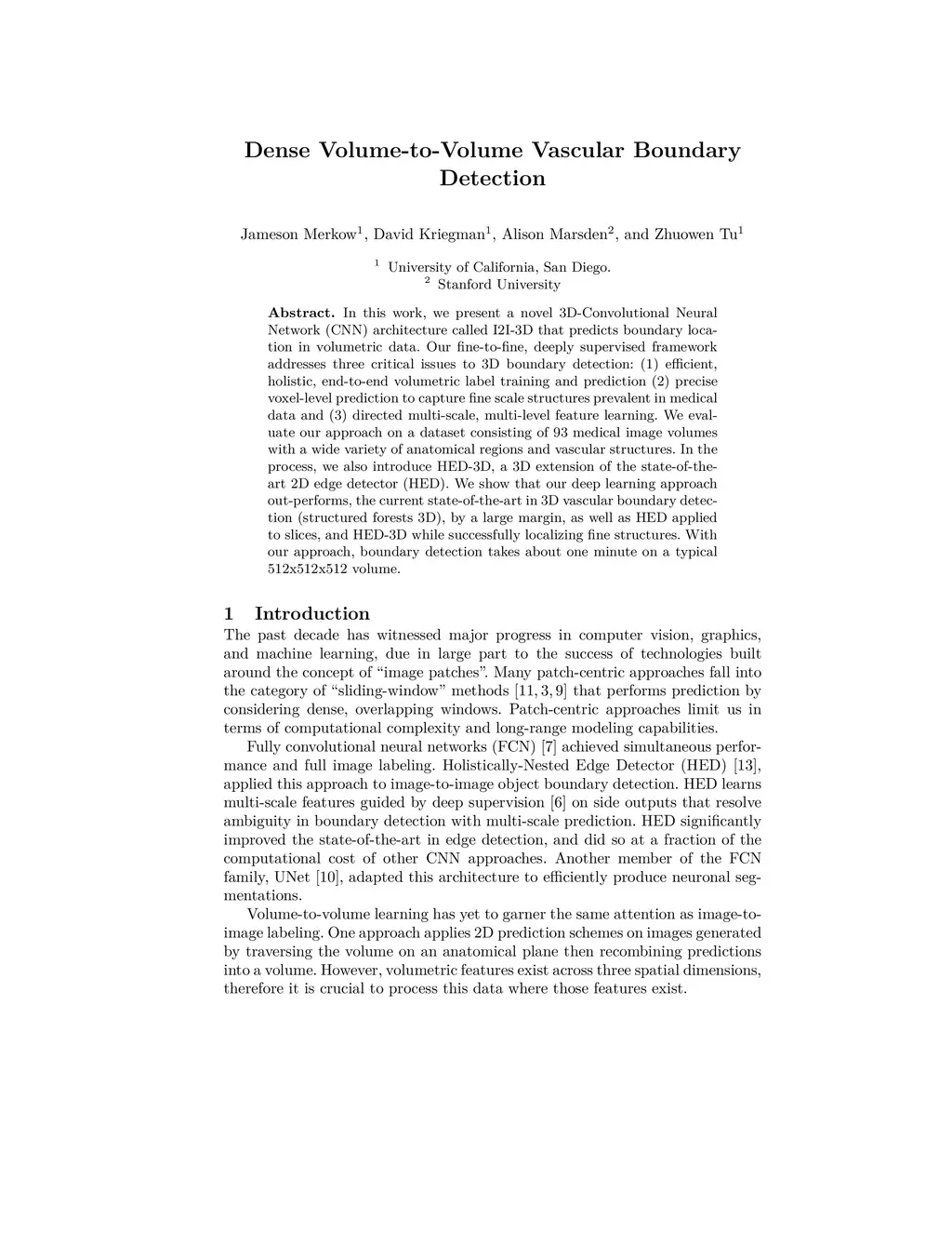 In this work, we present a novel 3D-Convolutional Neural Network (CNN) architecture called I2I-3D that predicts boundary location in volumetric data. Our fine-to-fine, deeply supervised framework addresses three critical issues to 3D boundary detection: (1) efficient, holistic, end-to-end volumetric label training and prediction (2) precise voxel-level prediction to capture fine scale structures prevalent in medical data and (3) directed multi-scale, multi-level feature learning. We evaluate our approach on a dataset consisting of 93 medical image volumes with a wide variety of anatomical regions and vascular structures. In the process, we also introduce HED-3D, a 3D extension of the state-of-the-art 2D edge detector (HED). We show that our deep learning approach out-performs, the current state-of-the-art in 3D vascular boundary detection (structured forests 3D), by a large margin, as well as HED applied to slices, and HED-3D while successfully localizing fine structures. With our approach, boundary detection takes about one minute on a typical 512x512x512 volume.
