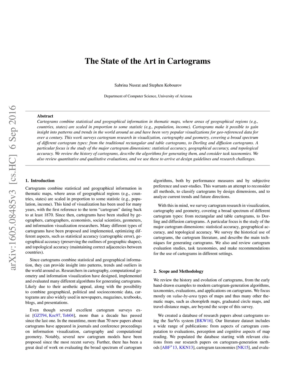 Cartograms combine statistical and geographical information in thematic maps, where areas of geographical regions (e.g., countries, states) are scaled in proportion to some statistic (e.g., population, income). Cartograms make it possible to gain insight into patterns and trends in the world around us and have been very popular visualizations for geo-referenced data for over a century. This work surveys cartogram research in visualization, cartography and geometry, covering a broad spectrum of different cartogram types: from the traditional rectangular and table cartograms, to Dorling and diffusion cartograms. A particular focus is the study of the major cartogram dimensions: statistical accuracy, geographical accuracy, and topological accuracy. We review the history of cartograms, describe the algorithms for generating them, and consider task taxonomies. We also review quantitative and qualitative evaluations, and we use these to arrive at design guidelines and research challenges.