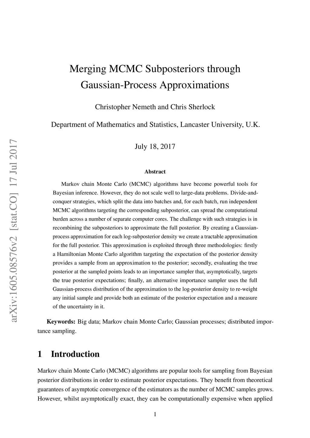 Markov chain Monte Carlo (MCMC) algorithms have become powerful tools for Bayesian inference. However, they do not scale well to large-data problems. Divide-and-conquer strategies, which split the data into batches and, for each batch, run independent MCMC algorithms targeting the corresponding subposterior, can spread the computational burden across a number of separate workers. The challenge with such strategies is in recombining the subposteriors to approximate the full posterior. By creating a Gaussian-process approximation for each log-subposterior density we create a tractable approximation for the full posterior. This approximation is exploited through three methodologies: firstly a Hamiltonian Monte Carlo algorithm targeting the expectation of the posterior density provides a sample from an approximation to the posterior; secondly, evaluating the true posterior at the sampled points leads to an importance sampler that, asymptotically, targets the true posterior expectations; finally, an alternative importance sampler uses the full Gaussian-process distribution of the approximation to the log-posterior density to re-weight any initial sample and provide both an estimate of the posterior expectation and a measure of the uncertainty in it.