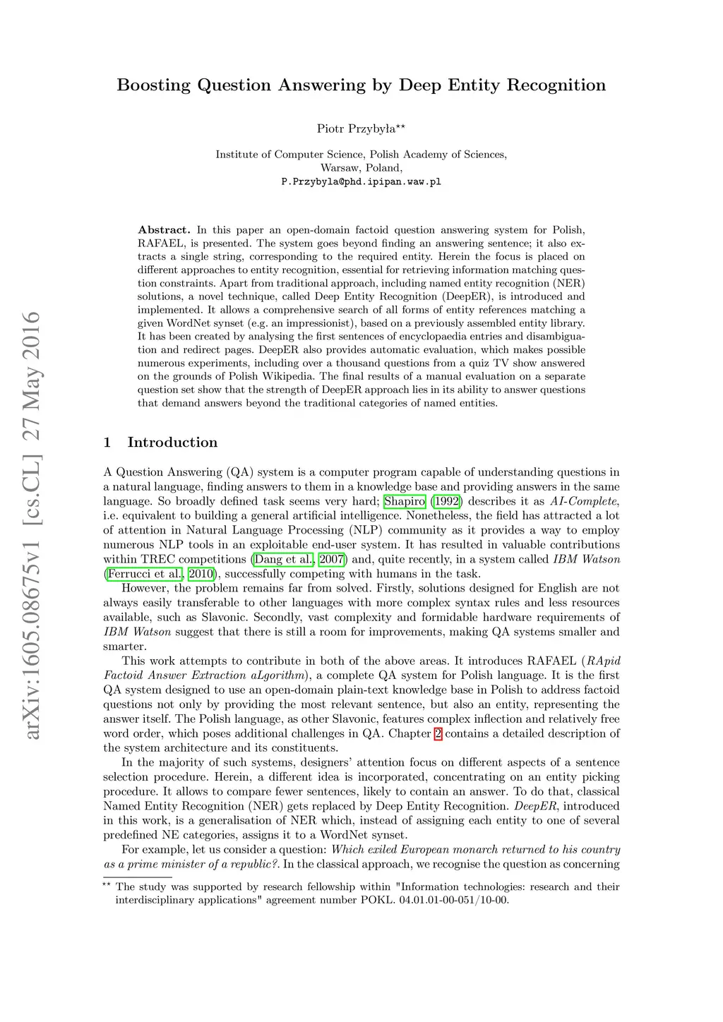 In this paper an open-domain factoid question answering system for Polish, RAFAEL, is presented. The system goes beyond finding an answering sentence; it also extracts a single string, corresponding to the required entity. Herein the focus is placed on different approaches to entity recognition, essential for retrieving information matching question constraints. Apart from traditional approach, including named entity recognition (NER) solutions, a novel technique, called Deep Entity Recognition (DeepER), is introduced and implemented. It allows a comprehensive search of all forms of entity references matching a given WordNet synset (e.g. an impressionist), based on a previously assembled entity library. It has been created by analysing the first sentences of encyclopaedia entries and disambiguation and redirect pages. DeepER also provides automatic evaluation, which makes possible numerous experiments, including over a thousand questions from a quiz TV show answered on the grounds of Polish Wikipedia. The final results of a manual evaluation on a separate question set show that the strength of DeepER approach lies in its ability to answer questions that demand answers beyond the traditional categories of named entities.