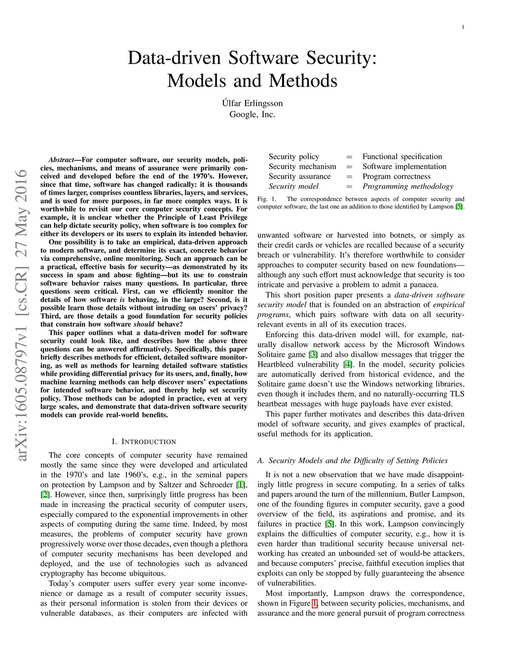 For computer software, our security models, policies, mechanisms, and means of assurance were primarily conceived and developed before the end of the 1970's. However, since that time, software has changed radically: it is thousands of times larger, comprises countless libraries, layers, and services, and is used for more purposes, in far more complex ways. It is worthwhile to revisit our core computer security concepts. For example, it is unclear whether the Principle of Least Privilege can help dictate security policy, when software is too complex for either its developers or its users to explain its intended behavior. This paper outlines a data-driven model for software security that takes an empirical, data-driven approach to modern software, and determines its exact, concrete behavior via comprehensive, online monitoring. Specifically, this paper briefly describes methods for efficient, detailed software monitoring, as well as methods for learning detailed software statistics while providing differential privacy for its users, and, finally, how machine learning methods can help discover users' expectations for intended software behavior, and thereby help set security policy. Those methods can be adopted in practice, even at very large scales, and demonstrate that data-driven software security models can provide real-world benefits.