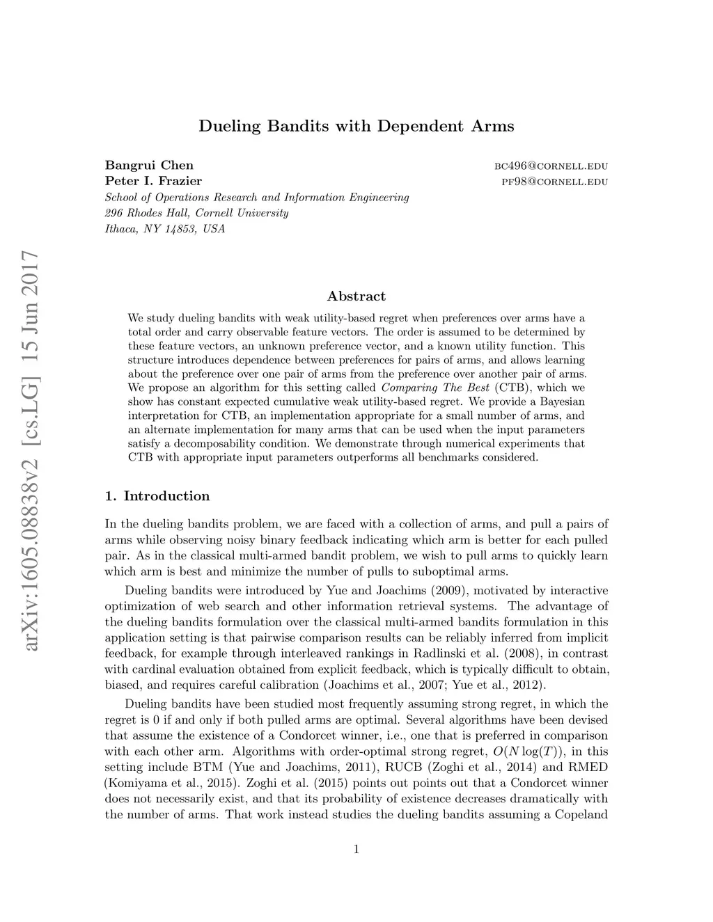 We study dueling bandits with weak utility-based regret when preferences over arms have a total order and carry observable feature vectors. The order is assumed to be determined by these feature vectors, an unknown preference vector, and a known utility function. This structure introduces dependence between preferences for pairs of arms, and allows learning about the preference over one pair of arms from the preference over another pair of arms. We propose an algorithm for this setting called Comparing The Best (CTB), which we show has constant expected cumulative weak utility-based regret. We provide a Bayesian interpretation for CTB, an implementation appropriate for a small number of arms, and an alternate implementation for many arms that can be used when the input parameters satisfy a decomposability condition. We demonstrate through numerical experiments that CTB with appropriate input parameters outperforms all benchmarks considered.