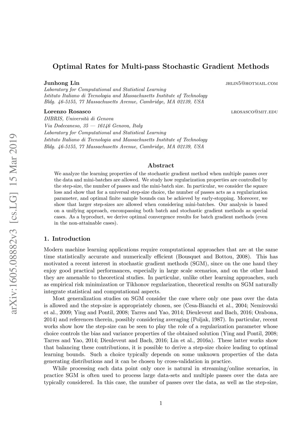 We analyze the learning properties of the stochastic gradient method when multiple passes over the data and mini-batches are allowed. We study how regularization properties are controlled by the step-size, the number of passes and the mini-batch size. In particular, we consider the square loss and show that for a universal step-size choice, the number of passes acts as a regularization parameter, and optimal finite sample bounds can be achieved by early-stopping. Moreover, we show that larger step-sizes are allowed when considering mini-batches. Our analysis is based on a unifying approach, encompassing both batch and stochastic gradient methods as special cases. As a byproduct, we derive optimal convergence results for batch gradient methods (even in the non-attainable cases).