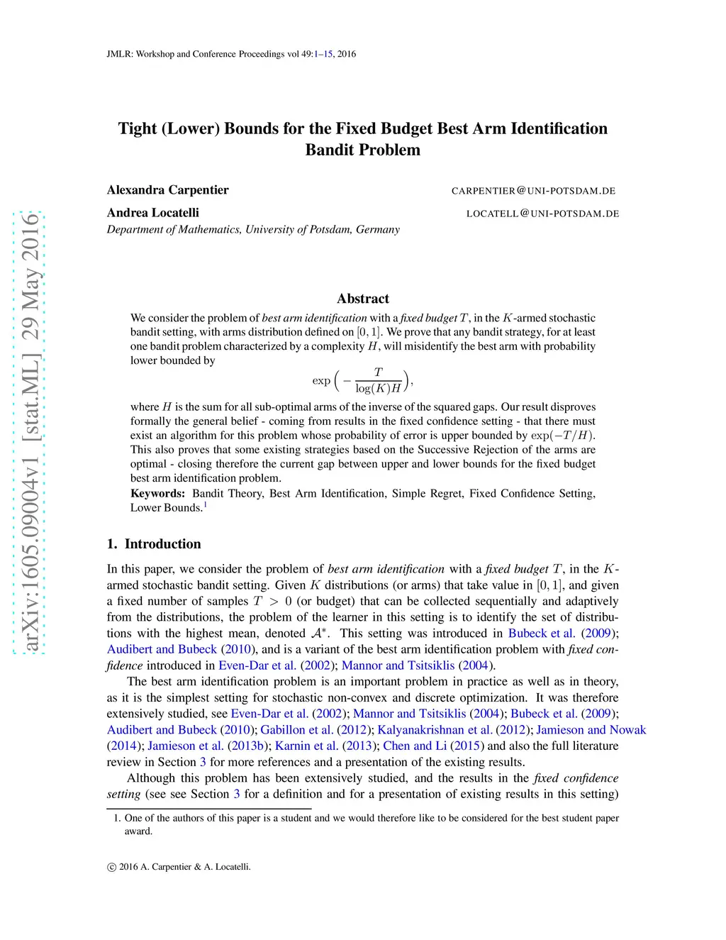 We consider the problem of \textit{best arm identification} with a \textit{fixed budget }, in the -armed stochastic bandit setting, with arms distribution defined on . We prove that any bandit strategy, for at least one bandit problem characterized by a complexity , will misidentify the best arm with probability lower bounded by where is the sum for all sub-optimal arms of the inverse of the squared gaps. Our result disproves formally the general belief - coming from results in the fixed confidence setting - that there must exist an algorithm for this problem whose probability of error is upper bounded by . This also proves that some existing strategies based on the Successive Rejection of the arms are optimal - closing therefore the current gap between upper and lower bounds for the fixed budget best arm identification problem.