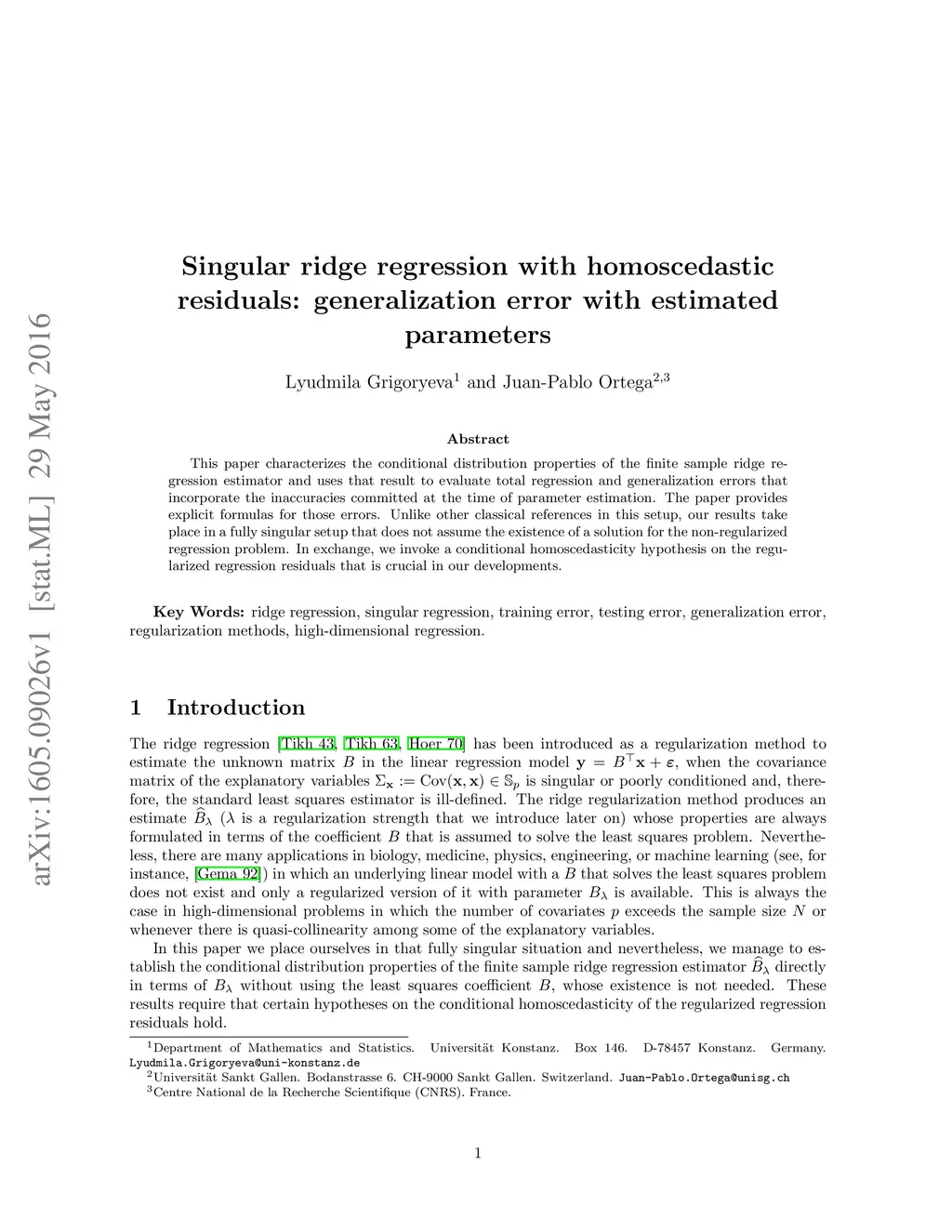 This paper characterizes the conditional distribution properties of the finite sample ridge regression estimator and uses that result to evaluate total regression and generalization errors that incorporate the inaccuracies committed at the time of parameter estimation. The paper provides explicit formulas for those errors. Unlike other classical references in this setup, our results take place in a fully singular setup that does not assume the existence of a solution for the non-regularized regression problem. In exchange, we invoke a conditional homoscedasticity hypothesis on the regularized regression residuals that is crucial in our developments.