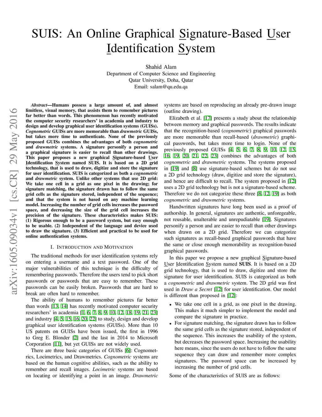 Humans possess a large amount of, and almost limitless, visual memory, that assists them to remember pictures far better than words. This phenomenon has recently motivated the computer security researchers' in academia and industry to design and develop graphical user identification systems (GUISs). Cognometric GUISs are more memorable than drawmetric GUISs, but takes more time to authenticate. None of the previously proposed GUISs combines the advantages of both cognometric and drawmetric systems. A signature personify a person and a graphical signature is easier to recall than other drawings. This paper proposes a new graphical Signature-based User Identification System named SUIS. It is based on a 2D grid technology, that is used to draw, digitize and store the signature for user identification. SUIS is categorized as both a cognometric and drawmetric system. Unlike other systems that use 2D grid: We take one cell in a grid as one pixel in the drawing; for signature matching, the signature drawn has to follow the same grid cells as the signature stored, independent of the sequence; and that the system is not based on any machine learning model. Increasing the number of grid cells increases the password space, and decreasing the size of the grid cell increases the precision of the signature. These characteristics makes SUIS: (1) Rigorous enough to be a password system, but easy enough to be usable. (2) Independent of the language and device used to draw the signature. (3) Efficient and practical to be used for online authentication systems.