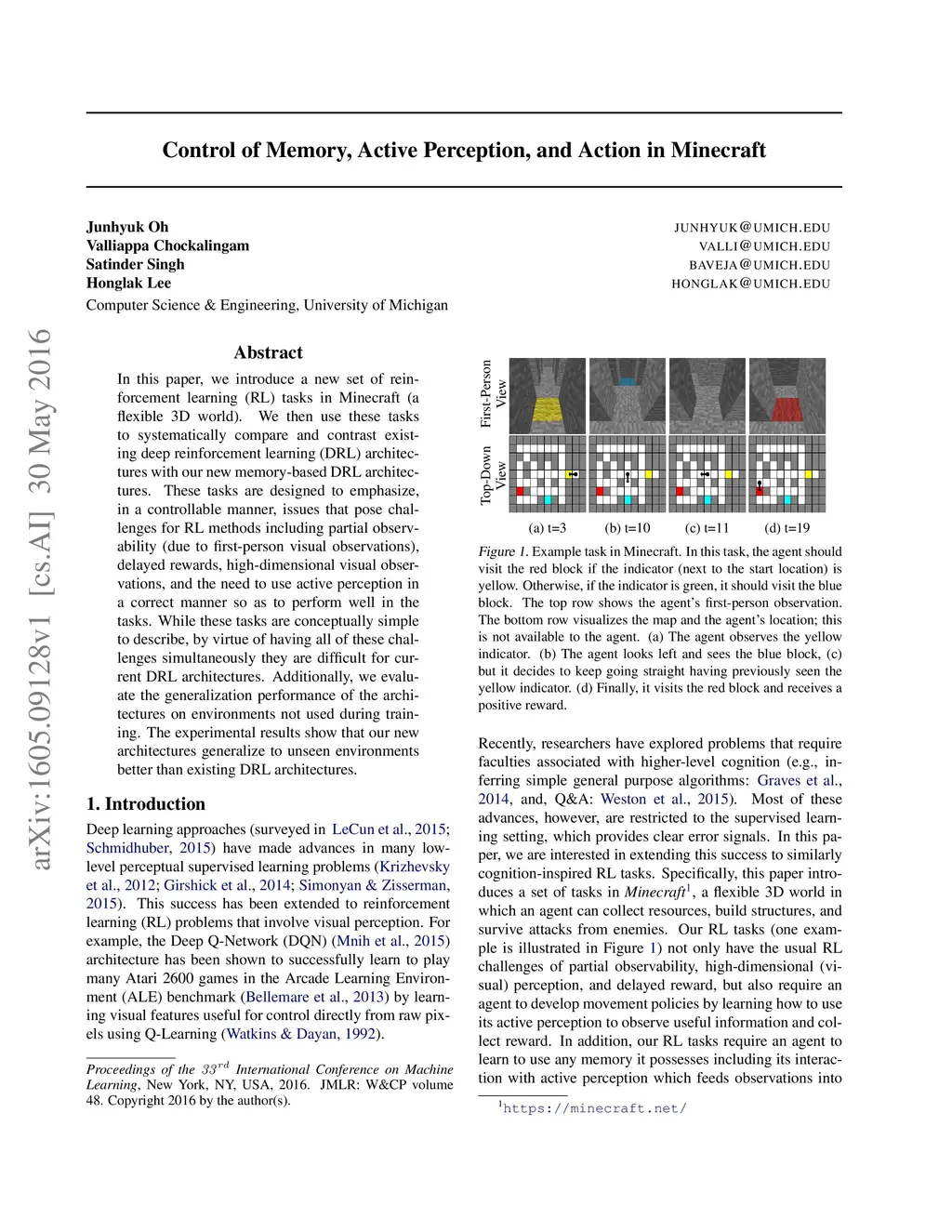 In this paper, we introduce a new set of reinforcement learning (RL) tasks in Minecraft (a flexible 3D world). We then use these tasks to systematically compare and contrast existing deep reinforcement learning (DRL) architectures with our new memory-based DRL architectures. These tasks are designed to emphasize, in a controllable manner, issues that pose challenges for RL methods including partial observability (due to first-person visual observations), delayed rewards, high-dimensional visual observations, and the need to use active perception in a correct manner so as to perform well in the tasks. While these tasks are conceptually simple to describe, by virtue of having all of these challenges simultaneously they are difficult for current DRL architectures. Additionally, we evaluate the generalization performance of the architectures on environments not used during training. The experimental results show that our new architectures generalize to unseen environments better than existing DRL architectures.