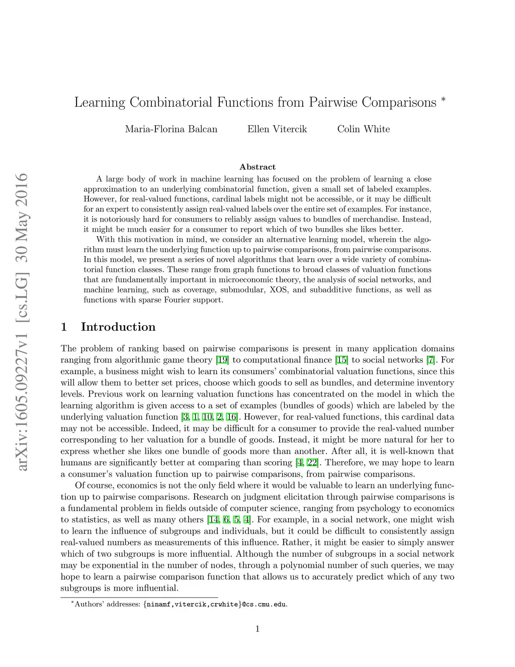 A large body of work in machine learning has focused on the problem of learning a close approximation to an underlying combinatorial function, given a small set of labeled examples. However, for real-valued functions, cardinal labels might not be accessible, or it may be difficult for an expert to consistently assign real-valued labels over the entire set of examples. For instance, it is notoriously hard for consumers to reliably assign values to bundles of merchandise. Instead, it might be much easier for a consumer to report which of two bundles she likes better. With this motivation in mind, we consider an alternative learning model, wherein the algorithm must learn the underlying function up to pairwise comparisons, from pairwise comparisons. In this model, we present a series of novel algorithms that learn over a wide variety of combinatorial function classes. These range from graph functions to broad classes of valuation functions that are fundamentally important in microeconomic theory, the analysis of social networks, and machine learning, such as coverage, submodular, XOS, and subadditive functions, as well as functions with sparse Fourier support.