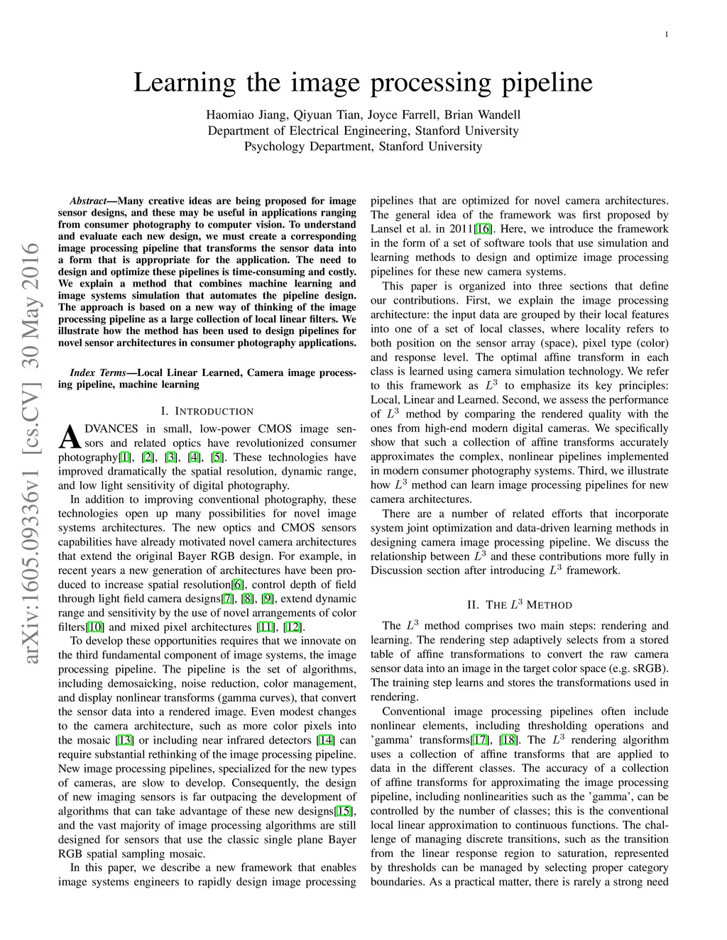 Many creative ideas are being proposed for image sensor designs, and these may be useful in applications ranging from consumer photography to computer vision. To understand and evaluate each new design, we must create a corresponding image processing pipeline that transforms the sensor data into a form that is appropriate for the application. The need to design and optimize these pipelines is time-consuming and costly. We explain a method that combines machine learning and image systems simulation that automates the pipeline design. The approach is based on a new way of thinking of the image processing pipeline as a large collection of local linear filters. We illustrate how the method has been used to design pipelines for novel sensor architectures in consumer photography applications.