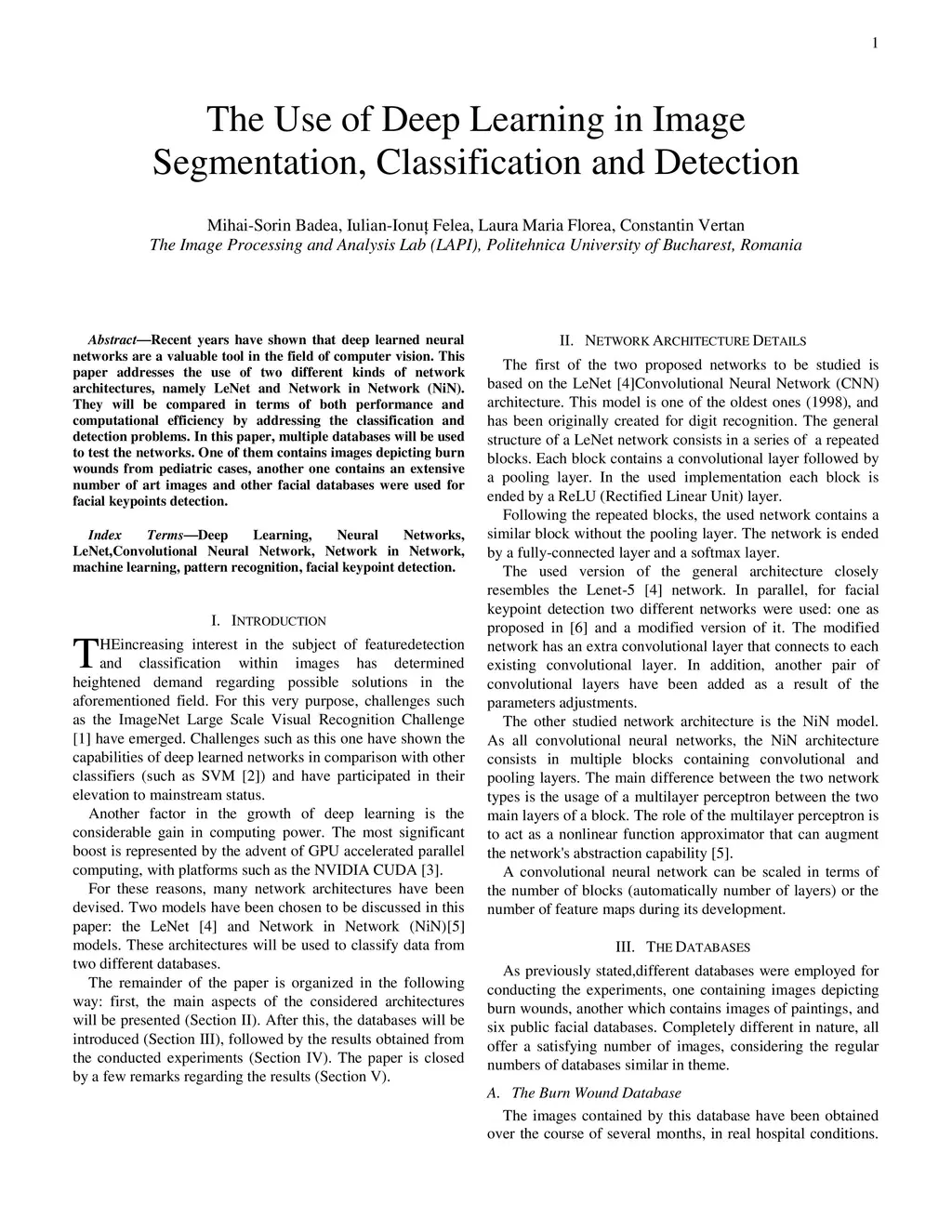 Recent years have shown that deep learned neural networks are a valuable tool in the field of computer vision. This paper addresses the use of two different kinds of network architectures, namely LeNet and Network in Network (NiN). They will be compared in terms of both performance and computational efficiency by addressing the classification and detection problems. In this paper, multiple databases will be used to test the networks. One of them contains images depicting burn wounds from pediatric cases, another one contains an extensive number of art images and other facial databases were used for facial keypoints detection.