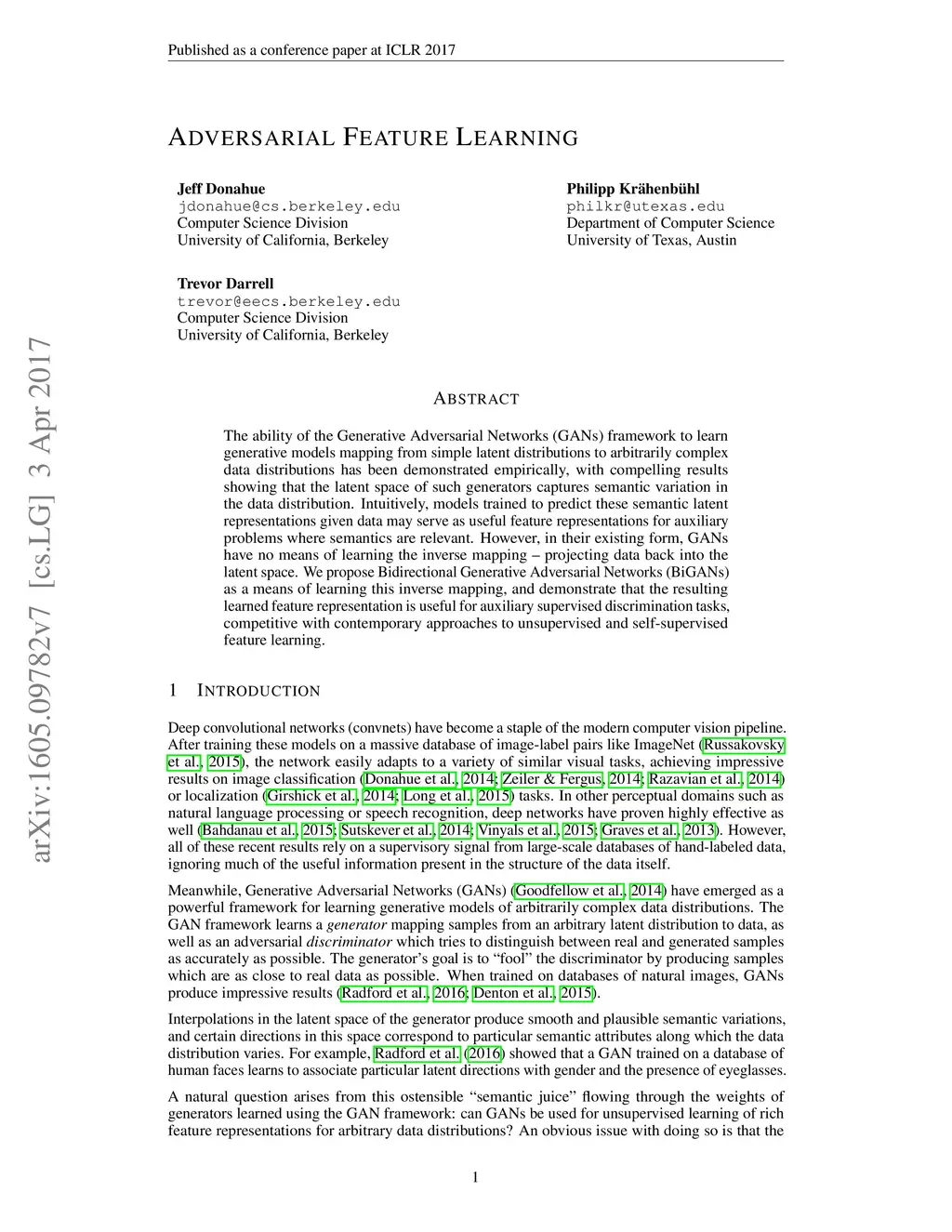 Adversarial Feature Learning