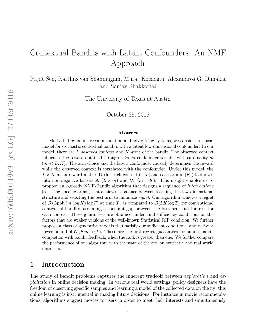 Motivated by online recommendation and advertising systems, we consider a causal model for stochastic contextual bandits with a latent low-dimensional confounder. In our model, there are observed contexts and arms of the bandit. The observed context influences the reward obtained through a latent confounder variable with cardinality (). The arm choice and the latent confounder causally determines the reward while the observed context is correlated with the confounder. Under this model, the mean reward matrix (for each context in and each arm in ) factorizes into non-negative factors () and (). This insight enables us to propose an -greedy NMF-Bandit algorithm that designs a sequence of interventions (selecting specific arms), that achieves a balance between learning this low-dimensional structure and selecting the best arm to minimize regret. Our algorithm achieves a regret of at time , as compared to for conventional contextual bandits, assuming a constant gap between the best arm and the rest for each context. These guarantees are obtained under mild sufficiency conditions on the factors that are weaker versions of the well-known Statistical RIP condition. We further propose a class of generative models that satisfy our sufficient conditions, and derive a lower bound of . These are the first regret guarantees for online matrix completion with bandit feedback, when the rank is greater than one. We further compare the performance of our algorithm with the state of the art, on synthetic and real world data-sets.