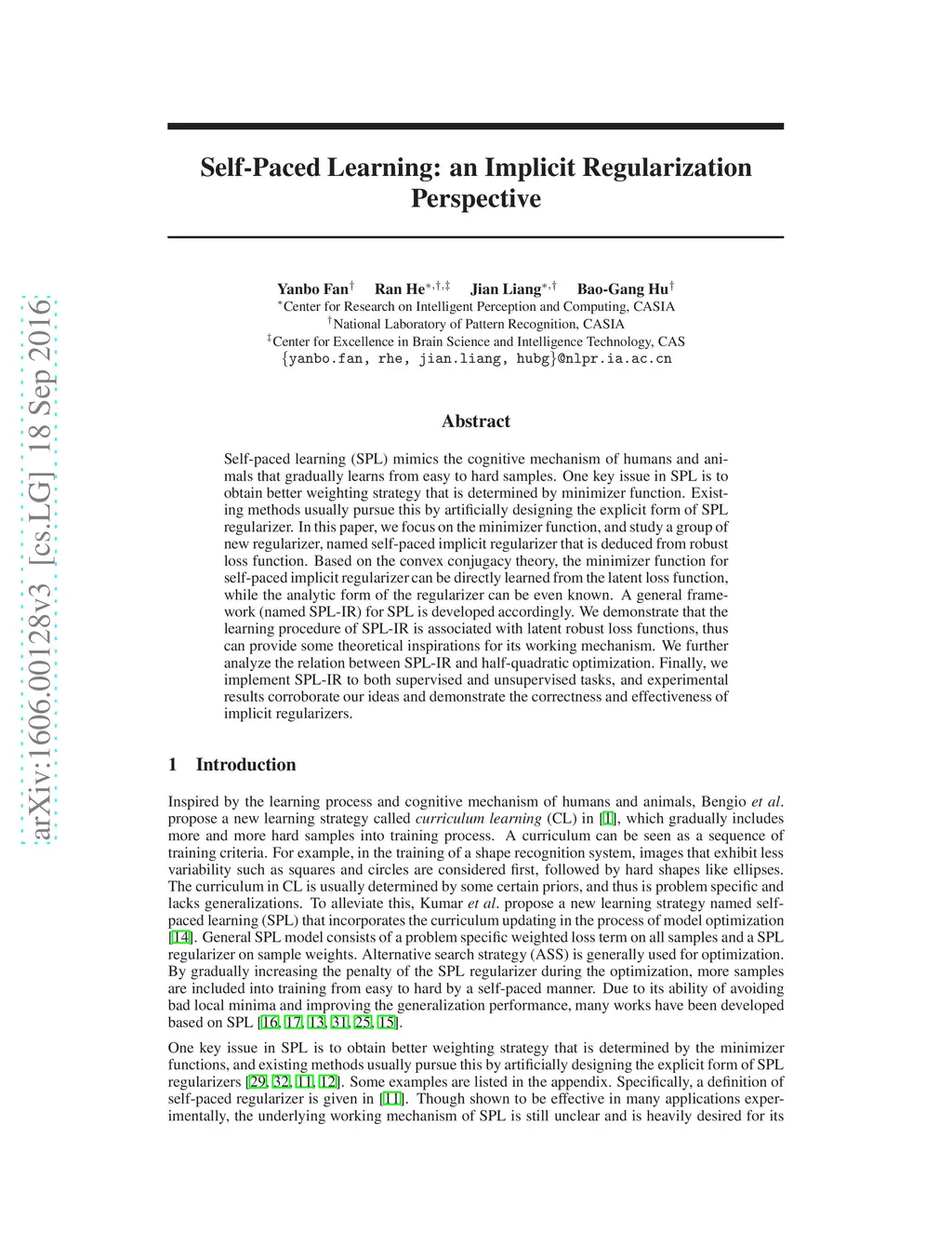 Self-paced learning (SPL) mimics the cognitive mechanism of humans and animals that gradually learns from easy to hard samples. One key issue in SPL is to obtain better weighting strategy that is determined by minimizer function. Existing methods usually pursue this by artificially designing the explicit form of SPL regularizer. In this paper, we focus on the minimizer function, and study a group of new regularizer, named self-paced implicit regularizer that is deduced from robust loss function. Based on the convex conjugacy theory, the minimizer function for self-paced implicit regularizer can be directly learned from the latent loss function, while the analytic form of the regularizer can be even known. A general framework (named SPL-IR) for SPL is developed accordingly. We demonstrate that the learning procedure of SPL-IR is associated with latent robust loss functions, thus can provide some theoretical inspirations for its working mechanism. We further analyze the relation between SPL-IR and half-quadratic optimization. Finally, we implement SPL-IR to both supervised and unsupervised tasks, and experimental results corroborate our ideas and demonstrate the correctness and effectiveness of implicit regularizers.