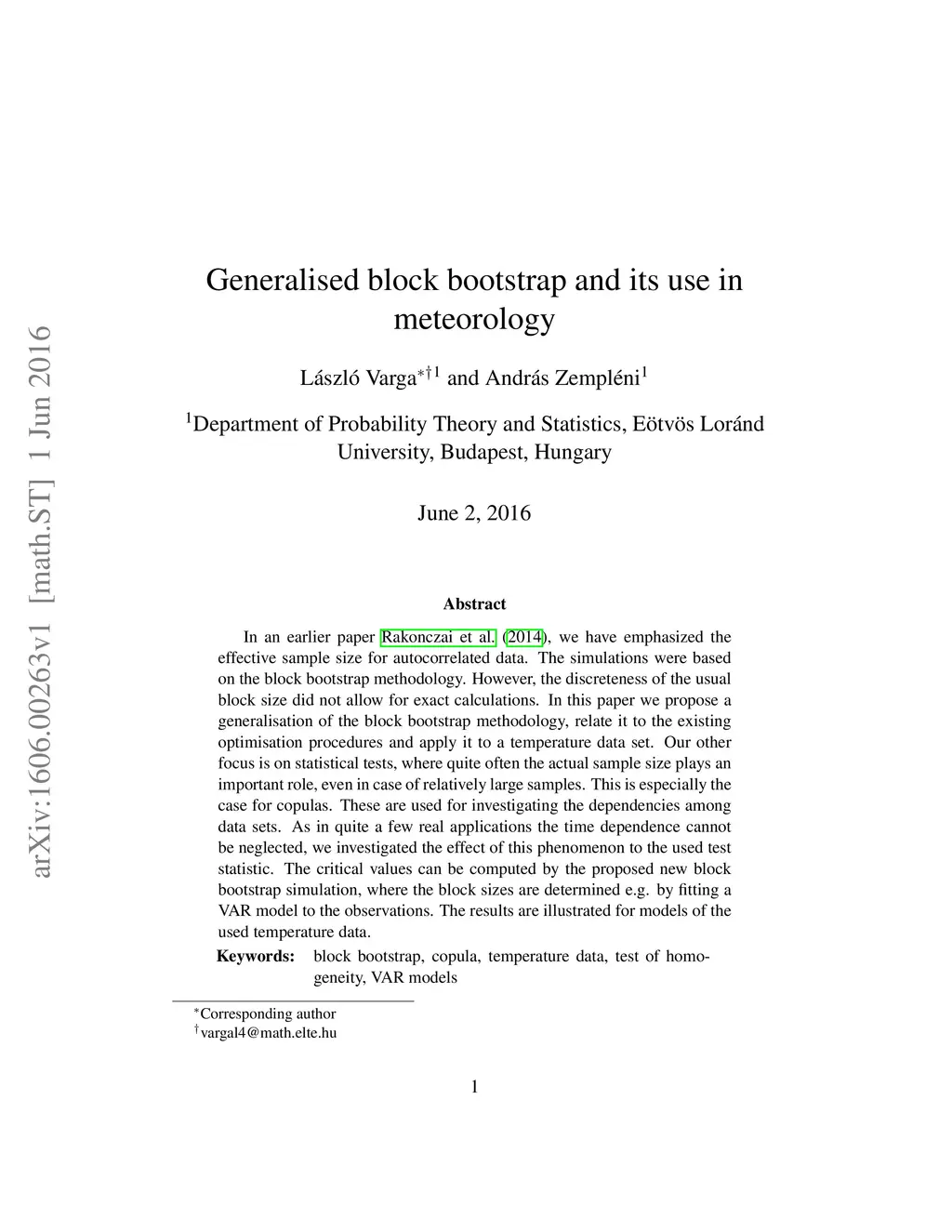 In an earlier paper Rakonczai et al. (2014), we have emphasized the effective sample size for autocorrelated data. The simulations were based on the block bootstrap methodology. However, the discreteness of the usual block size did not allow for exact calculations. In this paper we propose a generalisation of the block bootstrap methodology, relate it to the existing optimisation procedures and apply it to a temperature data set. Our other focus is on statistical tests, where quite often the actual sample size plays an important role, even in case of relatively large samples. This is especially the case for copulas. These are used for investigating the dependencies among data sets. As in quite a few real applications the time dependence cannot be neglected, we investigated the effect of this phenomenon to the used test statistic. The critical values can be computed by the proposed new block bootstrap simulation, where the block sizes are determined e.g. by fitting a VAR model to the observations. The results are illustrated for models of the used temperature data.