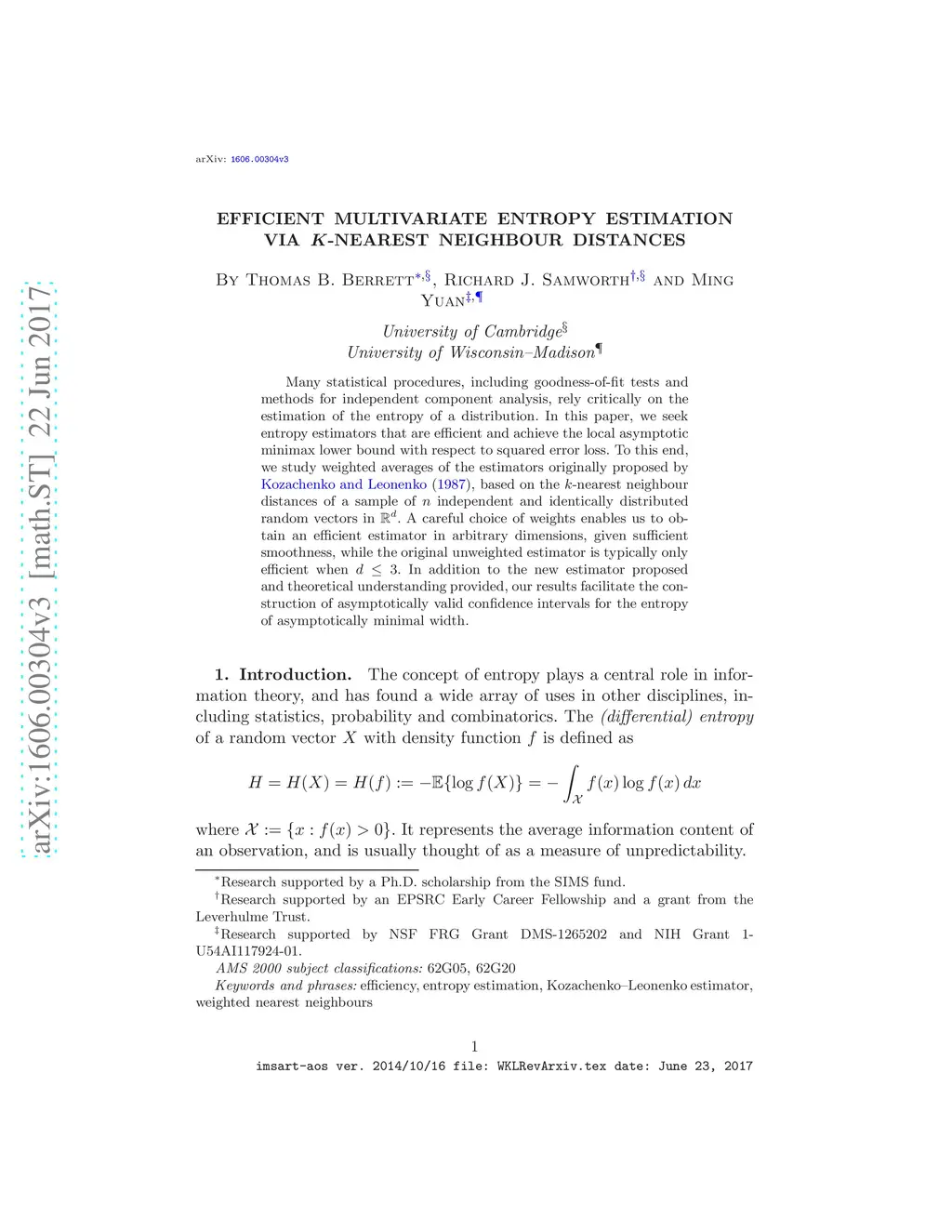 Many statistical procedures, including goodness-of-fit tests and methods for independent component analysis, rely critically on the estimation of the entropy of a distribution. In this paper, we seek entropy estimators that are efficient in the sense of achieving the local asymptotic minimax lower bound. To this end, we initially study a generalisation of the estimator originally proposed by \citet{Kozachenko:87}, based on the -nearest neighbour distances of a sample of independent and identically distributed random vectors in . When and provided (as well as other regularity conditions), we show that the estimator is efficient; on the other hand, when , a non-trivial bias precludes its efficiency regardless of the choice of . This motivates us to consider a new entropy estimator, formed as a weighted average of Kozachenko--Leonenko estimators for different values of . A careful choice of weights enables us to obtain an efficient estimator in arbitrary dimensions, given sufficient smoothness. In addition to the new estimator proposed and theoretical understanding provided, our results also have other methodological implications; in particular, they motivate the prewhitening of the data before applying the estimator and facilitate the construction of asymptotically valid confidence intervals of asymptotically minimal width.