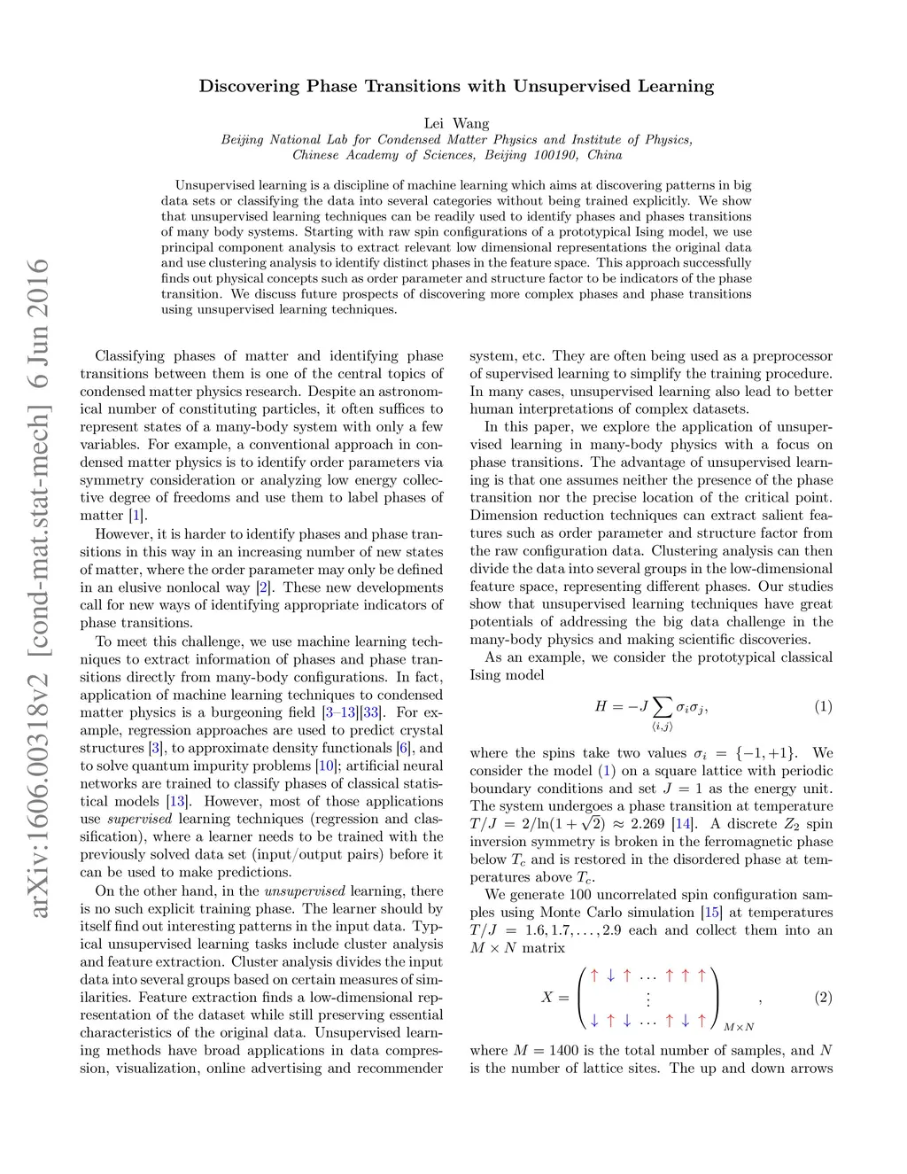 Unsupervised learning is a discipline of machine learning which aims at discovering patterns in big data sets or classifying the data into several categories without being trained explicitly. We show that unsupervised learning techniques can be readily used to identify phases and phases transitions of many body systems. Starting with raw spin configurations of a prototypical Ising model, we use principal component analysis to extract relevant low dimensional representations the original data and use clustering analysis to identify distinct phases in the feature space. This approach successfully finds out physical concepts such as order parameter and structure factor to be indicators of the phase transition. We discuss future prospects of discovering more complex phases and phase transitions using unsupervised learning techniques.