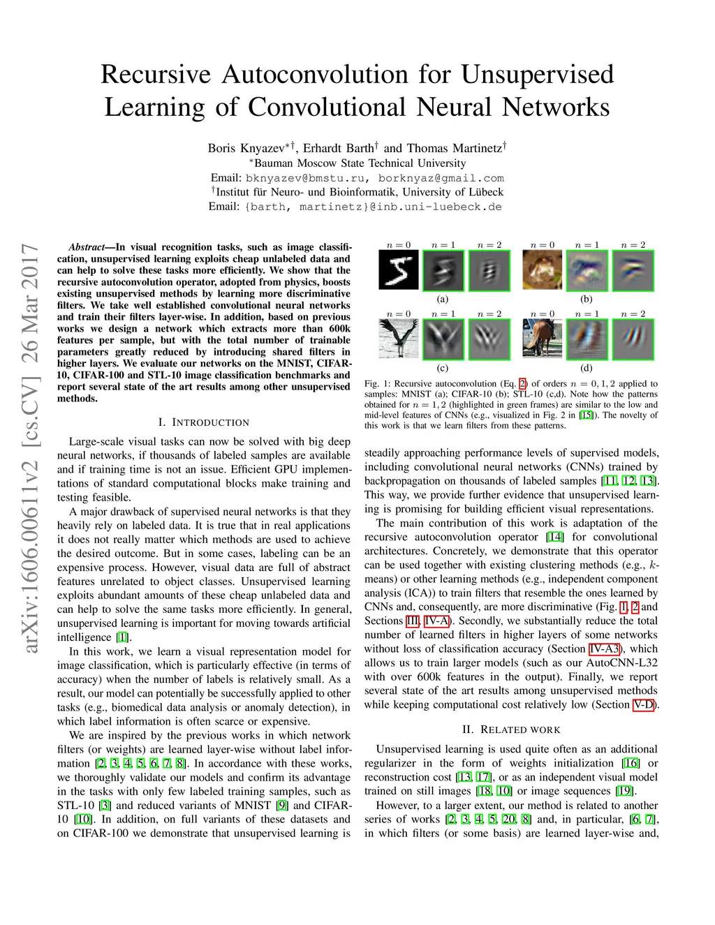 In visual recognition tasks, such as image classification, unsupervised learning exploits cheap unlabeled data and can help to solve these tasks more efficiently. We show that the recursive autoconvolution operator, adopted from physics, boosts existing unsupervised methods by learning more discriminative filters. We take well established convolutional neural networks and train their filters layer-wise. In addition, based on previous works we design a network which extracts more than 600k features per sample, but with the total number of trainable parameters greatly reduced by introducing shared filters in higher layers. We evaluate our networks on the MNIST, CIFAR-10, CIFAR-100 and STL-10 image classification benchmarks and report several state of the art results among other unsupervised methods.
