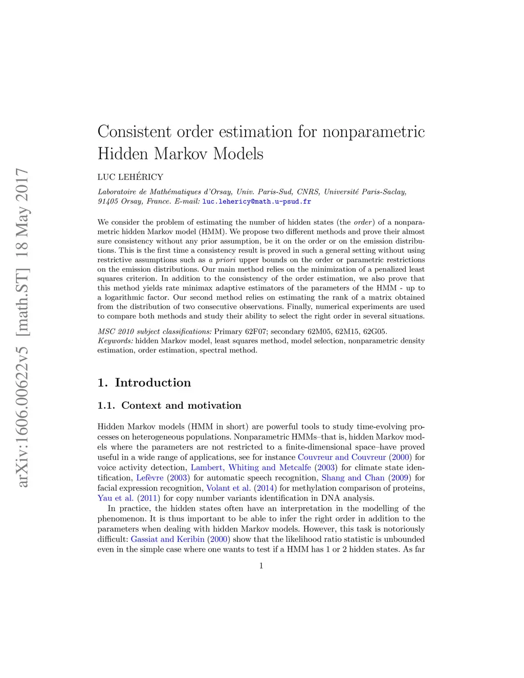 We consider the problem of estimating the number of hidden states (the order) of a nonparametric hidden Markov model (HMM). We propose two different methods and prove their almost sure consistency without any prior assumption, be it on the order or on the emission distributions. This is the first time a consistency result is proved in such a general setting without using restrictive assumptions such as a priori upper bounds on the order or parametric restrictions on the emission distributions. Our main method relies on the minimization of a penalized least squares criterion. In addition to the consistency of the order estimation, we also prove that this method yields rate minimax adaptive estimators of the parameters of the HMM - up to a logarithmic factor. Our second method relies on estimating the rank of a matrix obtained from the distribution of two consecutive observations. Finally, numerical experiments are used to compare both methods and study their ability to select the right order in several situations.