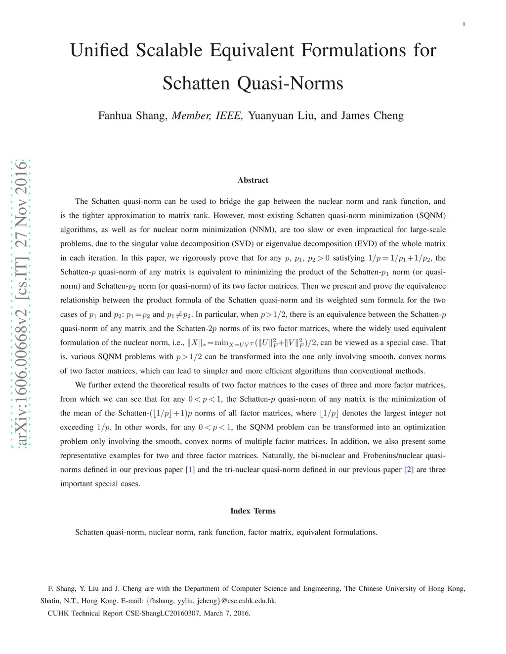 The Schatten quasi-norm can be used to bridge the gap between the nuclear norm and rank function, and is the tighter approximation to matrix rank. However, most existing Schatten quasi-norm minimization (SQNM) algorithms, as well as for nuclear norm minimization, are too slow or even impractical for large-scale problems, due to the SVD or EVD of the whole matrix in each iteration. In this paper, we rigorously prove that for any p, p1, p2>0 satisfying 1/p=1/p1+1/p2, the Schatten-p quasi-norm of any matrix is equivalent to minimizing the product of the Schatten-p1 norm (or quasi-norm) and Schatten-p2 norm (or quasi-norm) of its two factor matrices. Then we present and prove the equivalence relationship between the product formula of the Schatten quasi-norm and its weighted sum formula for the two cases of p1 and p2: p1=p2 and p1\neq p2. In particular, when p>1/2, there is an equivalence between the Schatten-p quasi-norm of any matrix and the Schatten-2p norms of its two factor matrices, where the widely used equivalent formulation of the nuclear norm can be viewed as a special case. That is, various SQNM problems with p>1/2 can be transformed into the one only involving smooth, convex norms of two factor matrices, which can lead to simpler and more efficient algorithms than conventional methods. We further extend the theoretical results of two factor matrices to the cases of three and more factor matrices, from which we can see that for any 0<p<1, the Schatten-p quasi-norm of any matrix is the minimization of the mean of the Schatten-(p3+1)p norms of all factor matrices, where p3 denotes the largest integer not exceeding 1/p. In other words, for any 0<p<1, the SQNM problem can be transformed into an optimization problem only involving the smooth, convex norms of multiple factor matrices.