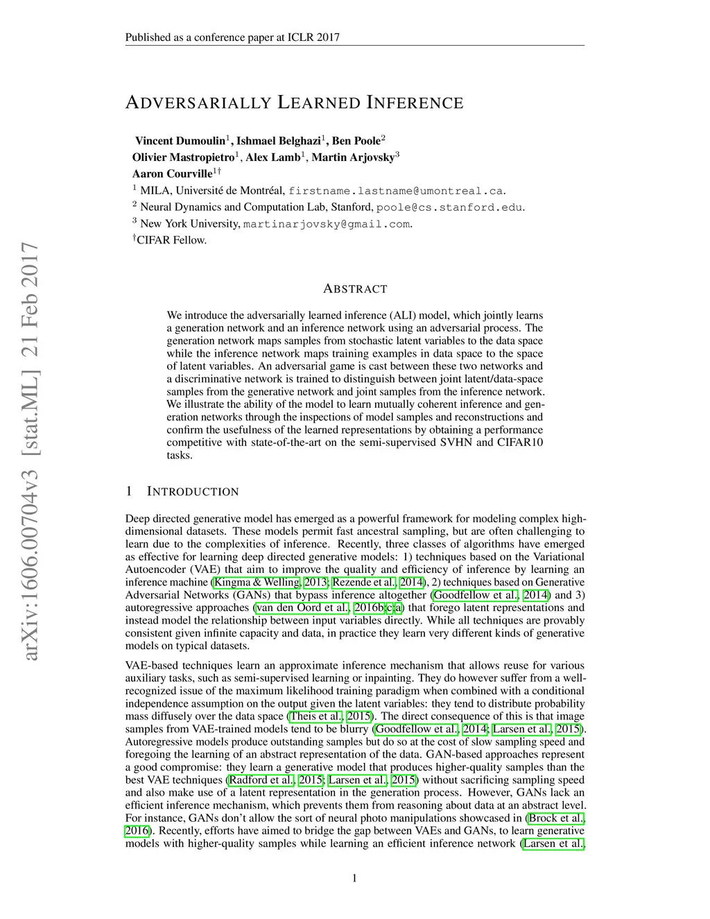 We introduce the adversarially learned inference (ALI) model, which jointly learns a generation network and an inference network using an adversarial process. The generation network maps samples from stochastic latent variables to the data space while the inference network maps training examples in data space to the space of latent variables. An adversarial game is cast between these two networks and a discriminative network is trained to distinguish between joint latent/data-space samples from the generative network and joint samples from the inference network. We illustrate the ability of the model to learn mutually coherent inference and generation networks through the inspections of model samples and reconstructions and confirm the usefulness of the learned representations by obtaining a performance competitive with state-of-the-art on the semi-supervised SVHN and CIFAR10 tasks.