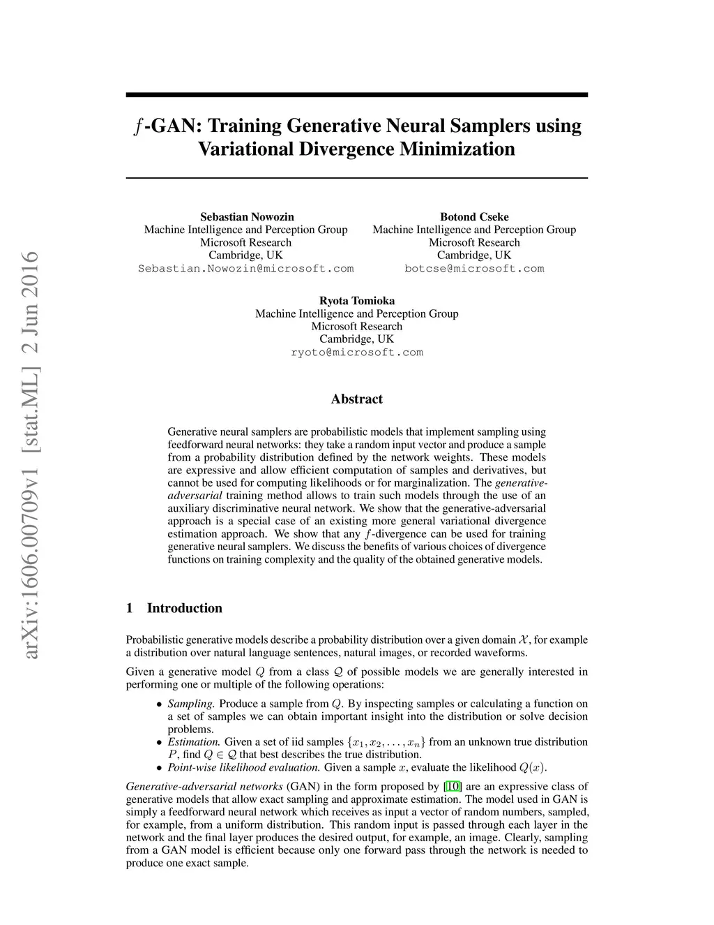 f-GAN: Training Generative Neural Samplers using Variational Divergence