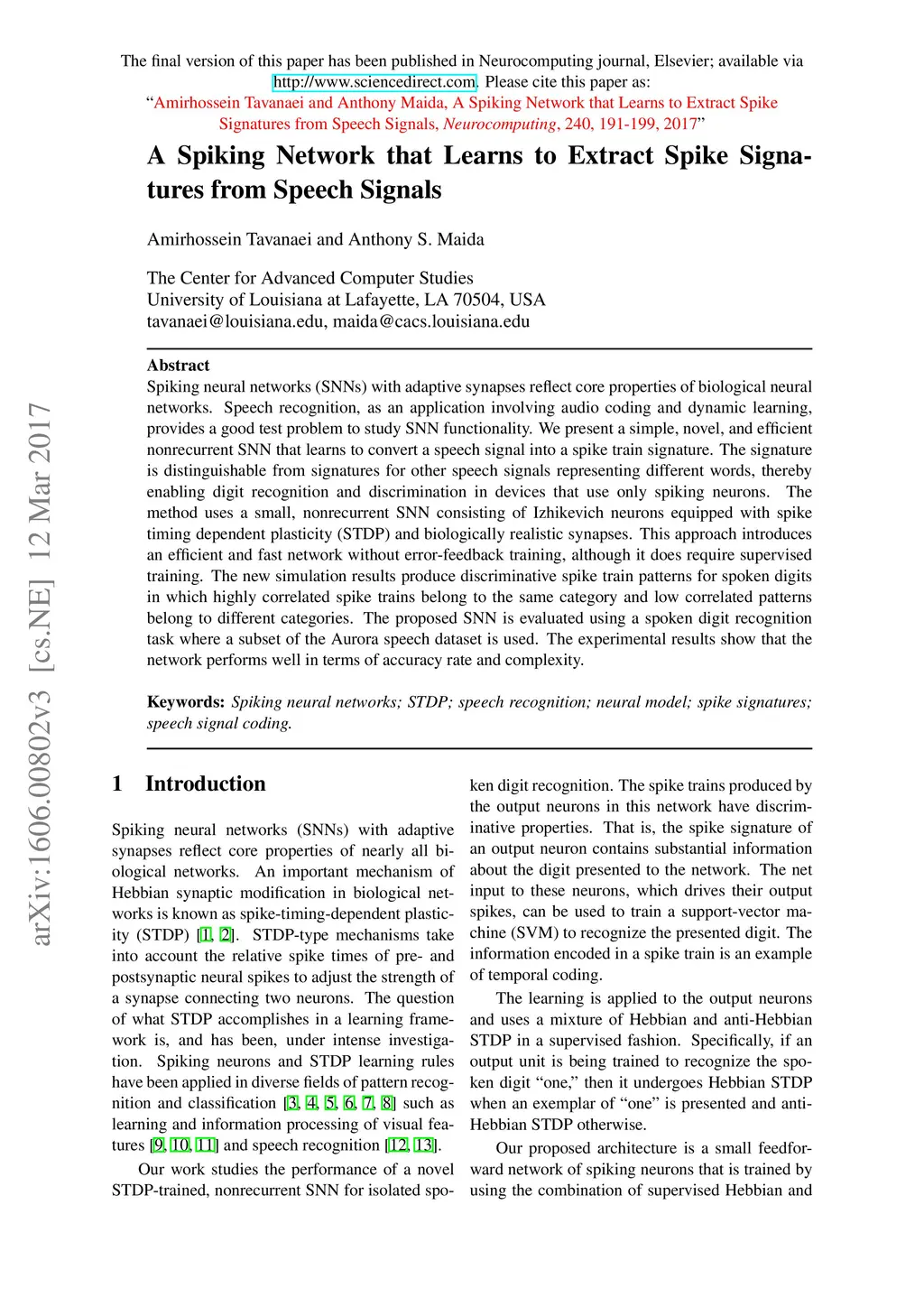 A Spiking Network that Learns to Extract Spike Signatures from Speech