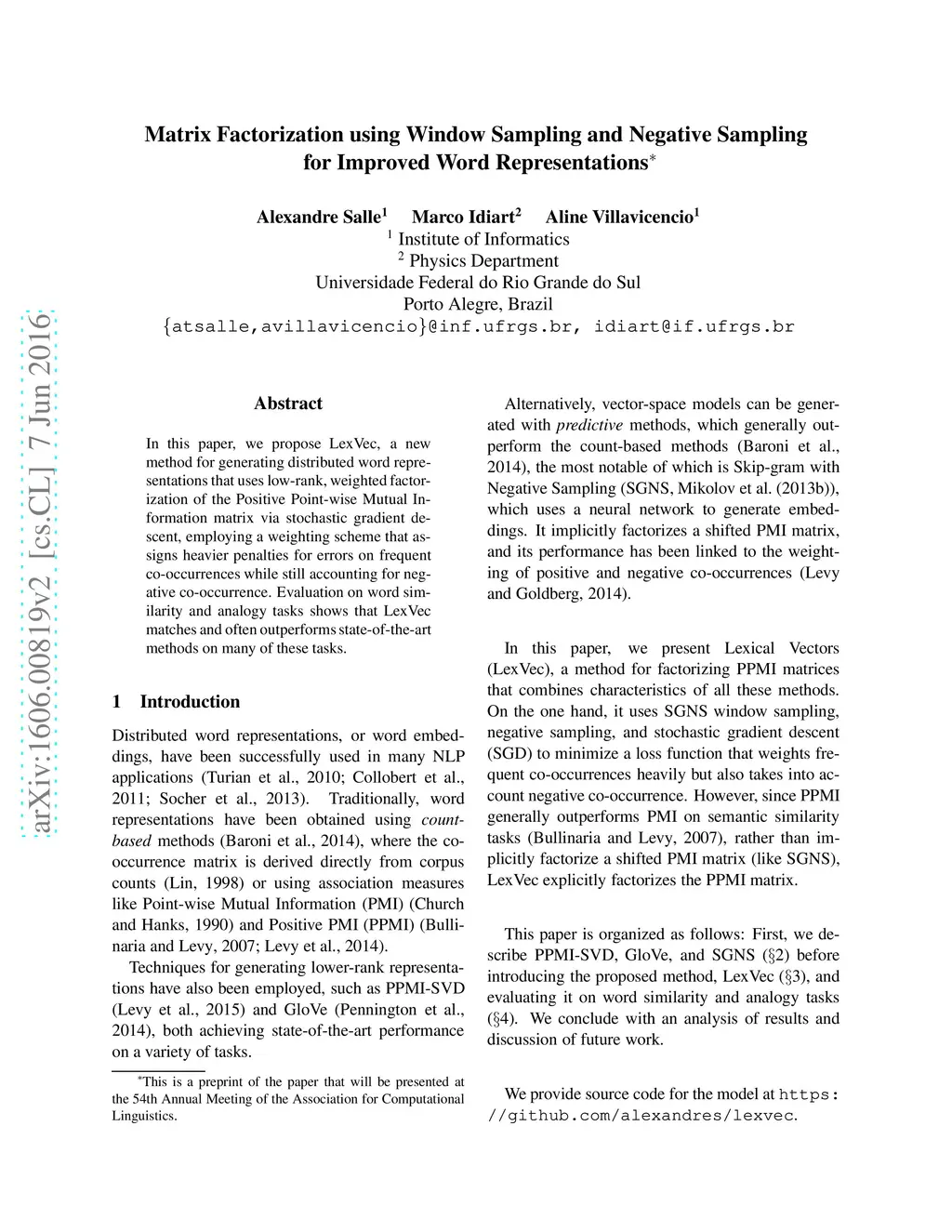 In this paper, we propose LexVec, a new method for generating distributed word representations that uses low-rank, weighted factorization of the Positive Point-wise Mutual Information matrix via stochastic gradient descent, employing a weighting scheme that assigns heavier penalties for errors on frequent co-occurrences while still accounting for negative co-occurrence. Evaluation on word similarity and analogy tasks shows that LexVec matches and often outperforms state-of-the-art methods on many of these tasks.
