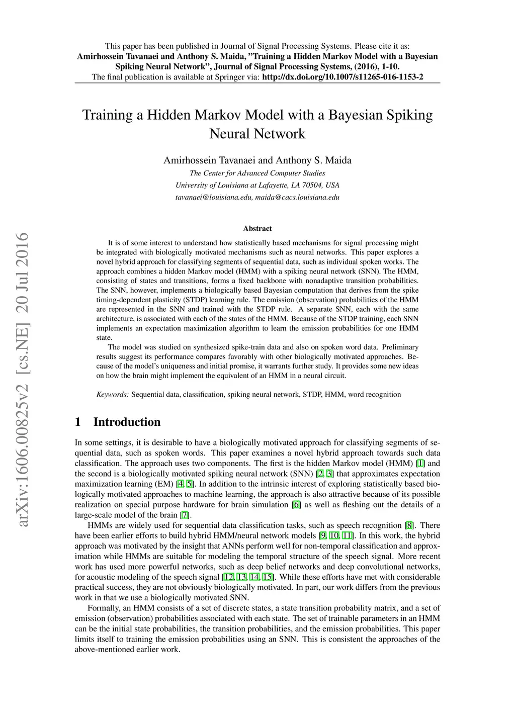 It is of some interest to understand how statistically based mechanisms for signal processing might be integrated with biologically motivated mechanisms such as neural networks. This paper explores a novel hybrid approach for classifying segments of sequential data, such as individual spoken works. The approach combines a hidden Markov model (HMM) with a spiking neural network (SNN). The HMM, consisting of states and transitions, forms a fixed backbone with nonadaptive transition probabilities. The SNN, however, implements a biologically based Bayesian computation that derives from the spike timing-dependent plasticity (STDP) learning rule. The emission (observation) probabilities of the HMM are represented in the SNN and trained with the STDP rule. A separate SNN, each with the same architecture, is associated with each of the states of the HMM. Because of the STDP training, each SNN implements an expectation maximization algorithm to learn the emission probabilities for one HMM state. The model was studied on synthesized spike-train data and also on spoken word data. Preliminary results suggest its performance compares favorably with other biologically motivated approaches. Because of the model's uniqueness and initial promise, it warrants further study. It provides some new ideas on how the brain might implement the equivalent of an HMM in a neural circuit.