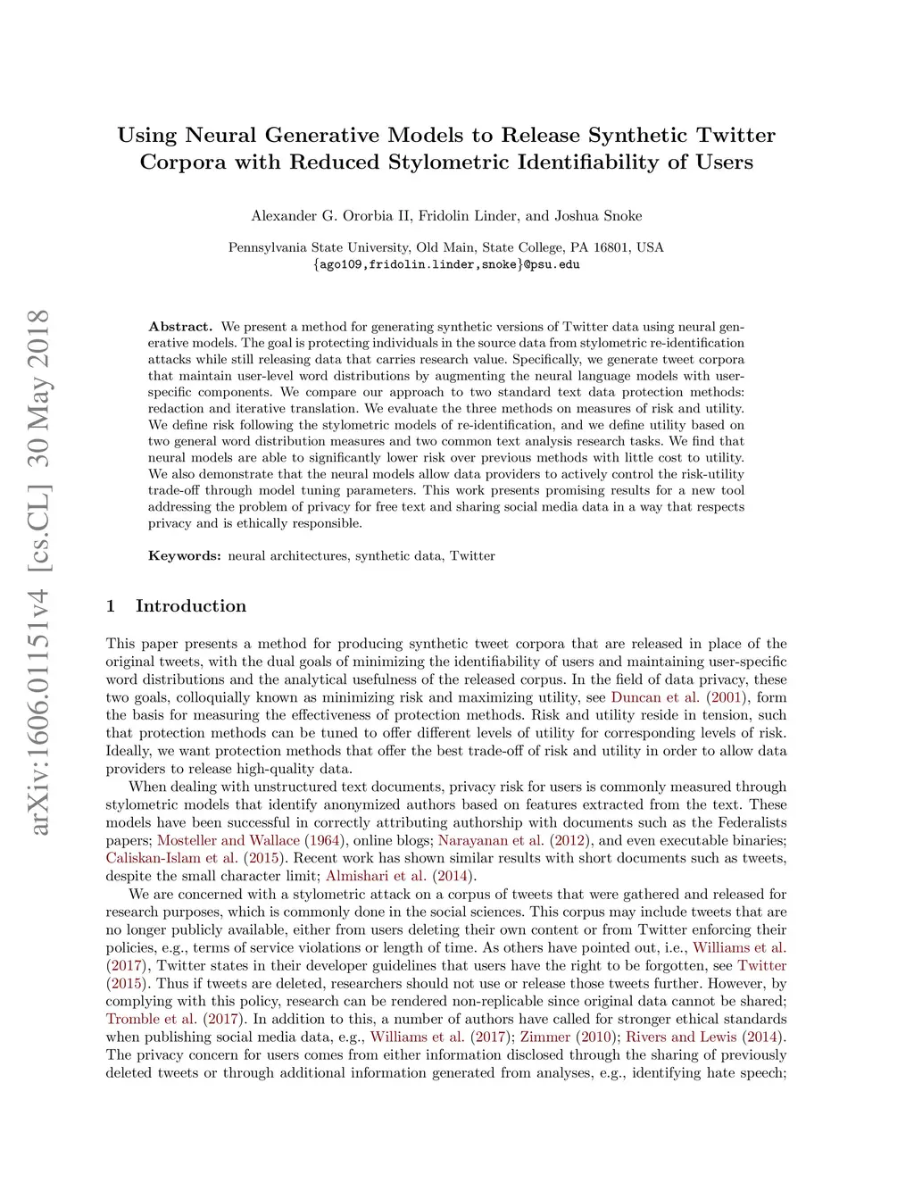 We present a method for generating synthetic versions of Twitter data using neural generative models. The goal is protecting individuals in the source data from stylometric re-identification attacks while still releasing data that carries research value. Specifically, we generate tweet corpora that maintain user-level word distributions by augmenting the neural language models with user-specific components. We compare our approach to two standard text data protection methods: redaction and iterative translation. We evaluate the three methods on measures of risk and utility. We define risk following the stylometric models of re-identification, and we define utility based on two general word distribution measures and two common text analysis research tasks. We find that neural models are able to significantly lower risk over previous methods with little cost to utility. We also demonstrate that the neural models allow data providers to actively control the risk-utility trade-off through model tuning parameters. This work presents promising results for a new tool addressing the problem of privacy for free text and sharing social media data in a way that respects privacy and is ethically responsible.