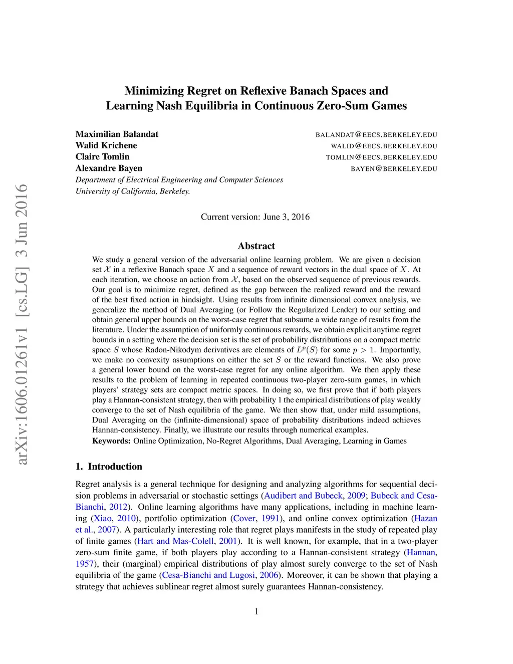 Minimizing Regret on Reflexive Banach Spaces and Learning Nash