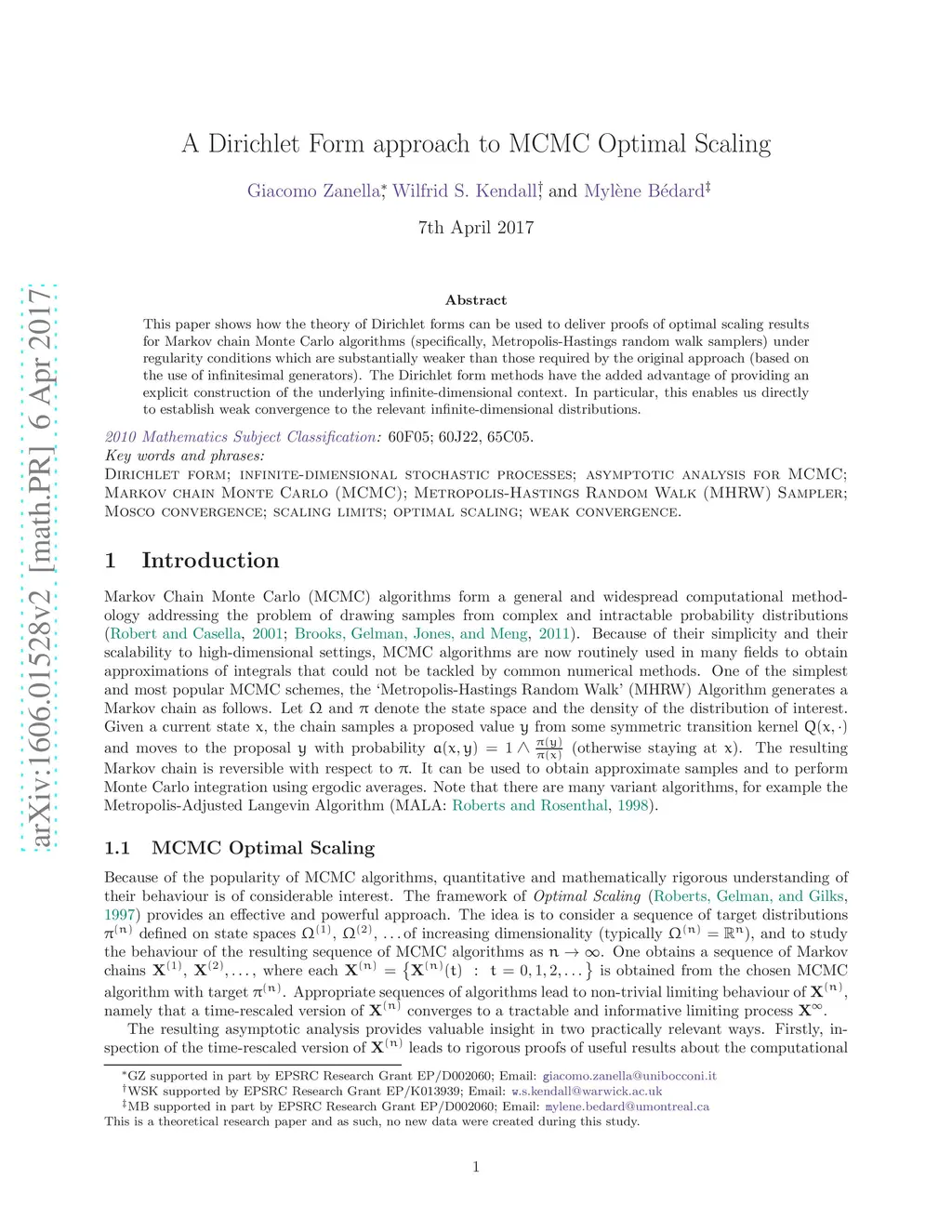 This paper develops the use of Dirichlet forms to deliver proofs of optimal scaling results for Markov chain Monte Carlo algorithms (specifically, Metropolis-Hastings random walk samplers) under regularity conditions which are substantially weaker than those required by the original approach (based on the use of infinitesimal generators). The Dirichlet form methods have the added advantage of providing an explicit construction of the underlying infinite-dimensional context. In particular, this enables us directly to establish weak convergence to the relevant infinite-dimensional distributions.